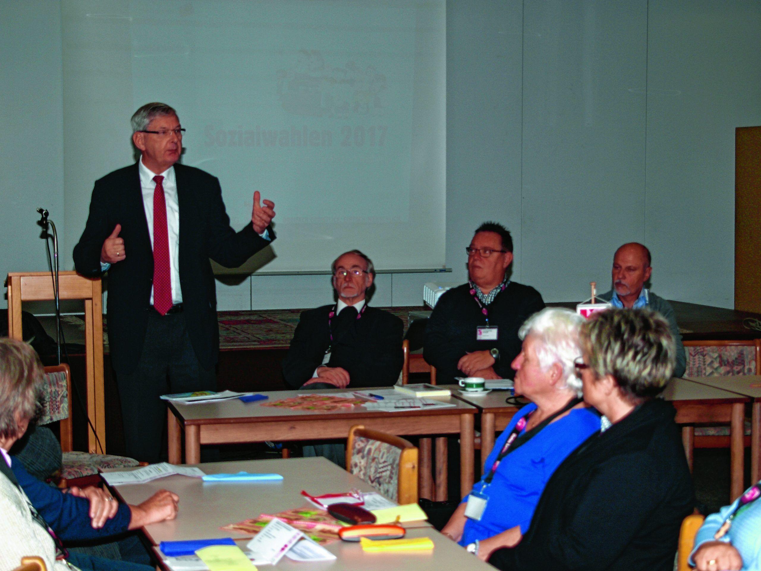 Der Arbeitsmarkt- und sozialpolitische Sprecher der CDU/CSU erklärte im Vortrag, dass auch in den Rentenkassen und den Berufsgenossenschaften 2017 Vertreter gewählt werden. Bei allen Institutionen stellt die Arbeitsgemeinschaft Christlicher Arbeitnehmerorganisationen (ACA) Kandidaten. Zur ACA gehören Kolping, die Katholische Arbeitnehmer Bewegung (KAB) und der Bundesverband evangelischer Arbeitnehmerorganisationen. Die gewählten Vertreter haben in den Gremien die Entscheidungsfreiheit über den Haushalt und Personalfragen. Aus ihren Reihen werden Mitglieder für die Widerspruchsausschüsse bestimmt und bei der Rentenkasse die Rentenältesten. Diese werden geschult und beraten dann ehrenamtlich vor Ort bei Fragen zur Rente.