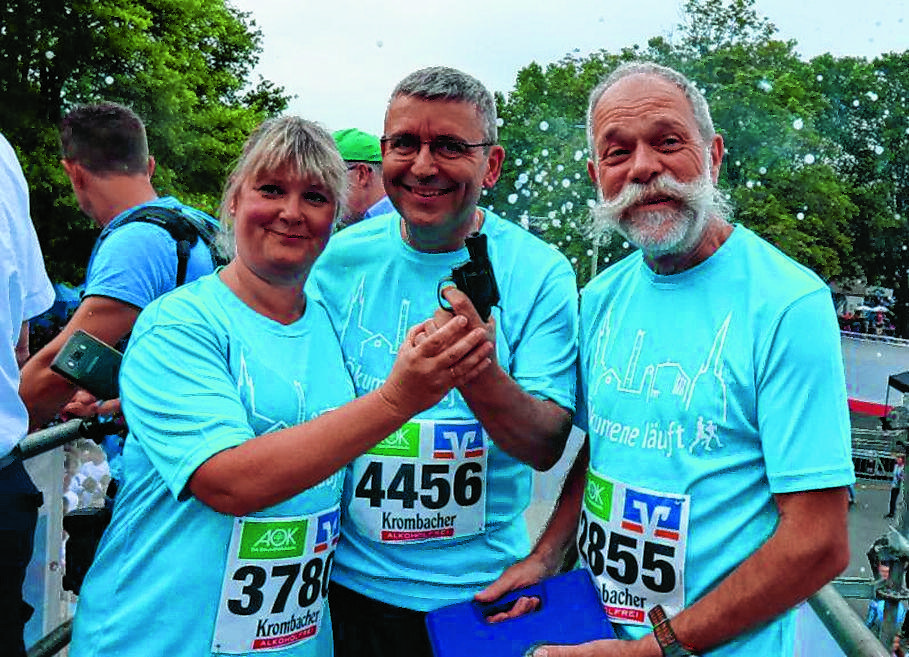 Die Idee wurde beim 6. Siegerländer Firmenlauf geboren. In diesem Jahr wurde eine Rekordbeteiligung von 19 Läuferinnen und Läufern erreicht. Gemeinsam gingen sie auf die Strecke von 5,2 Kilometern. „Als Gruppe in einem Starterfeld von 8 500 Teilnehmern gemeinsam ans Ziel zu kommen, war eine echte Herausforderung“, berichtet Reimund Ditsche. „Es war aber auch eine Erfahrung, achtsam zu sein, auf den anderen Rücksicht zu nehmen und so den gemeinsamen Ziel­einlauf zu erreichen.“ Glaube und Laufen hätten gemeinsam, dass beide die Gemeinschaft und das Miteinander suchen und ein gemeinsames Ziel haben. Besonderheit in diesem Jahr war, dass Stephanie Kafka-­Klein von der evangelischen Kirchengemeinde Klafeld und Dechant Karl-Hans Köhle von der katholischen Kirchengemeinde St. Joseph Weidenau den Startschuss zum Firmenlauf gaben.