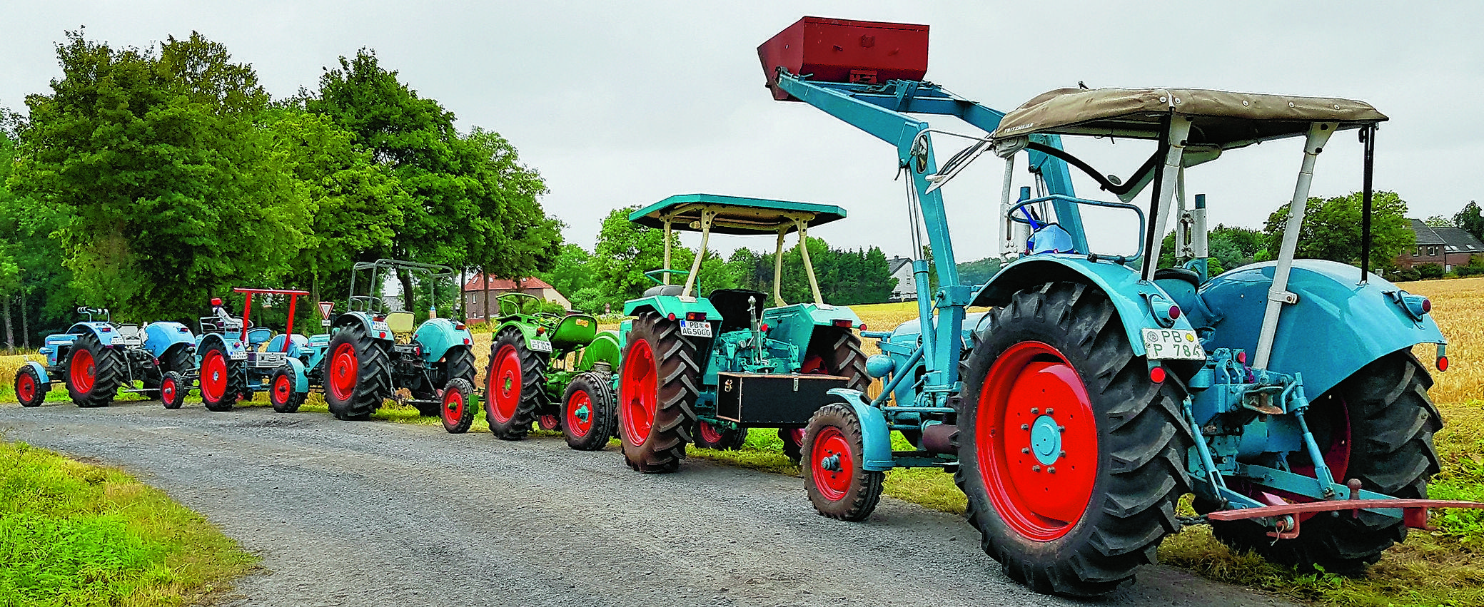 Eicher, Fendt, Kramer, Deutz, Hanomag – die Markennamen der vor sich hin tuckernden Schmuckstücke lassen die Augen von Treckerfreunden leuchten. Auch ein Ford ist dabei, ebenso ein Unimog („Universalmotorgerät“). Sogar ein Porsche ist mit von der Partie. Der Schlepper ist zwar nicht so schnell wie die Sportwagen aus dem gleichen Hause, doch mit seiner schnittigen Haube und der leuchtend roten Farbe zeigt er, dass er etwas Besonderes ist.