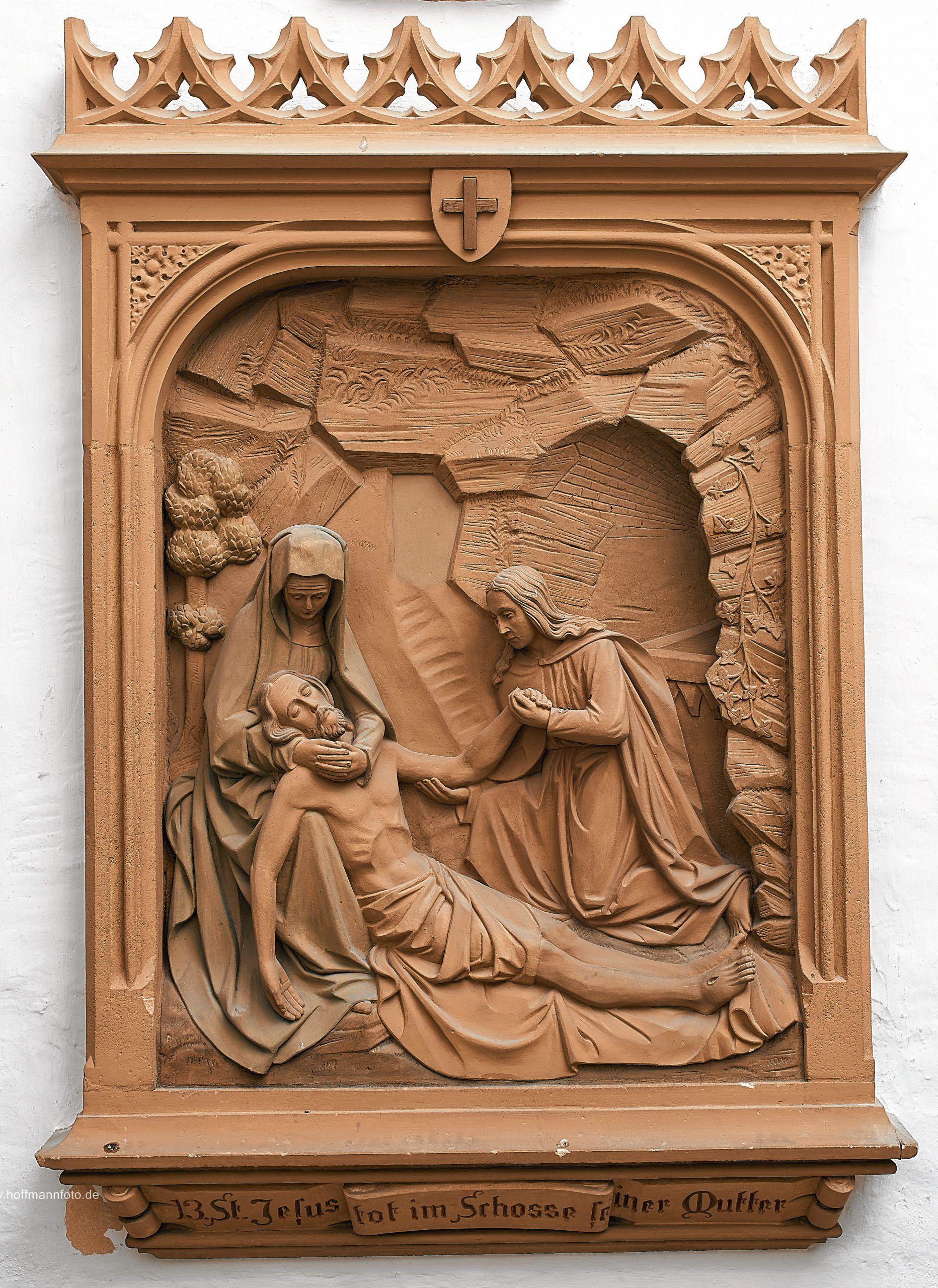 Es ist die 13., die vorletzte Station: Jesus wird in den Schoß seiner Mutter gelegt. Die Pieta, die Ikone des Leides schlechthin. Es gibt erschütternde Darstellungen davon, denn diese Situation ist an Dramatik kaum zu überbieten. Seit Menschen Kriege führen, halten immer wieder Mütter ihre toten Söhne im Arm. In der Tagesschau sieht man manchmal solche Szenen aus den Krisengebieten dieser Welt: Mütter, die ihre Verzweiflung in Fernsehkameras schreien oder ohnmächtig zusammensinken. Furchtbar!