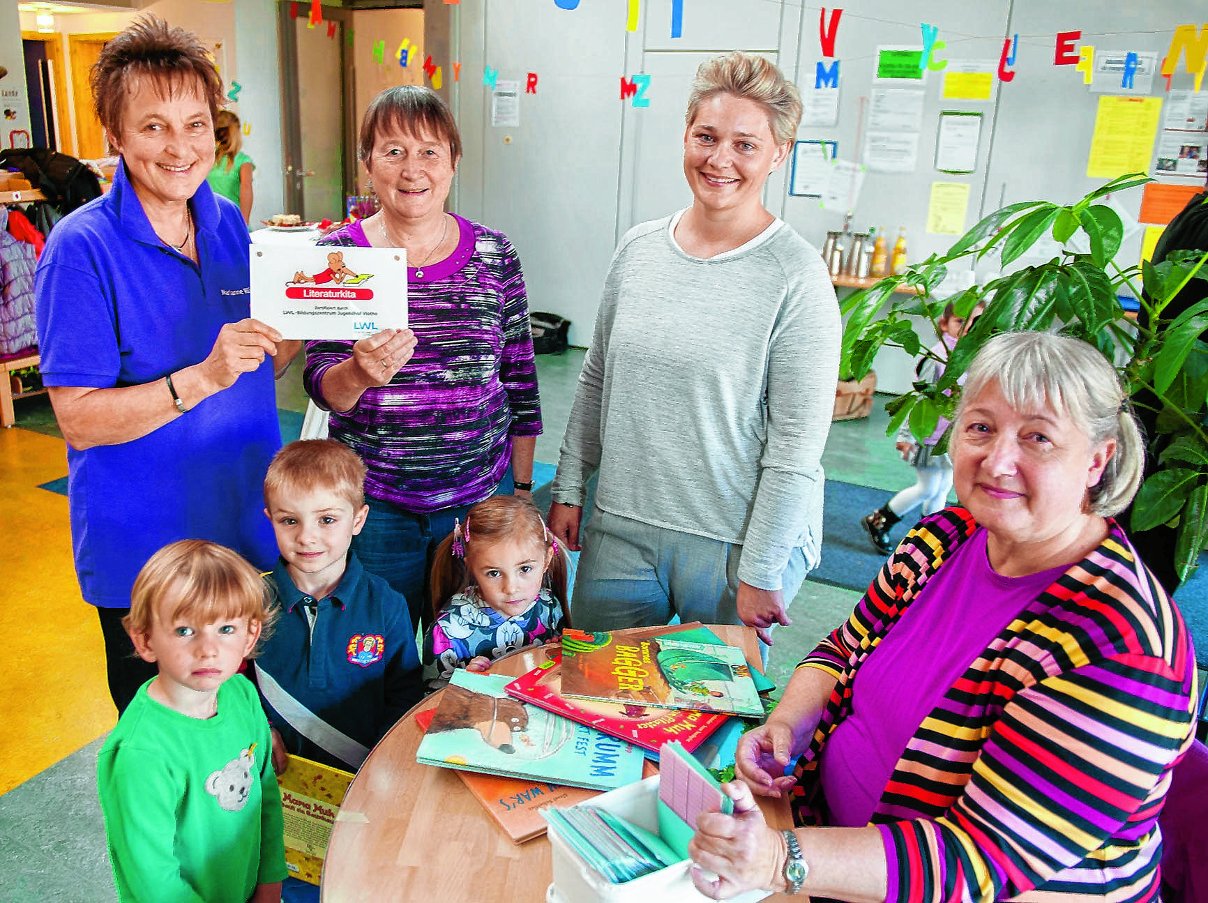 Freuen sich über die Auszeichnung: Die kleinen Nachwuchsleser (vorn) sind genauso begeistert wie (v. l.) Leiterin Marianne Rüdel, Dorothee Stieber-Schöll vom Jugendhof Vlotho, die die Auszeichnung übergab, Merle Engelbart-Zeitz vom Fachbereich Pädagogik des Trägers der Einrichtung und Angelika Mikus, Leiterin der KÖB St. Bartholomäus. Foto: Wiedenhaus
