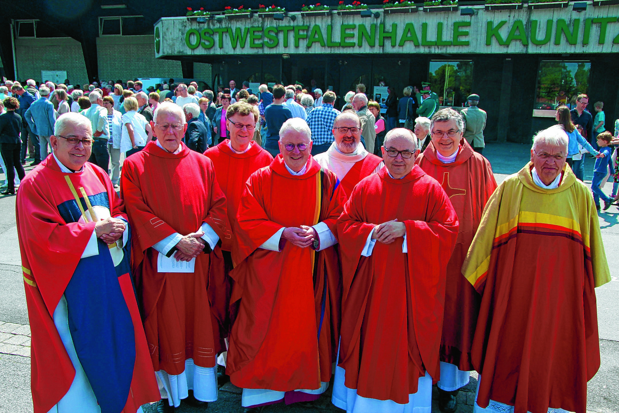 Mit einer heiligen Messe in der Ostwestfalenhalle Kaunitz startete der neue pastorale Raum. Mit dabei (von links) die Geistlichen Joachim Cruse, Hermann-Josef Klöpper, Johannes Epkenhans, Josef Dieste, Diakon Wolfgang Schinke, Karl-Josef Auris, Markus Korsus sowie Dieter Osthus. Foto: Berenbrinker