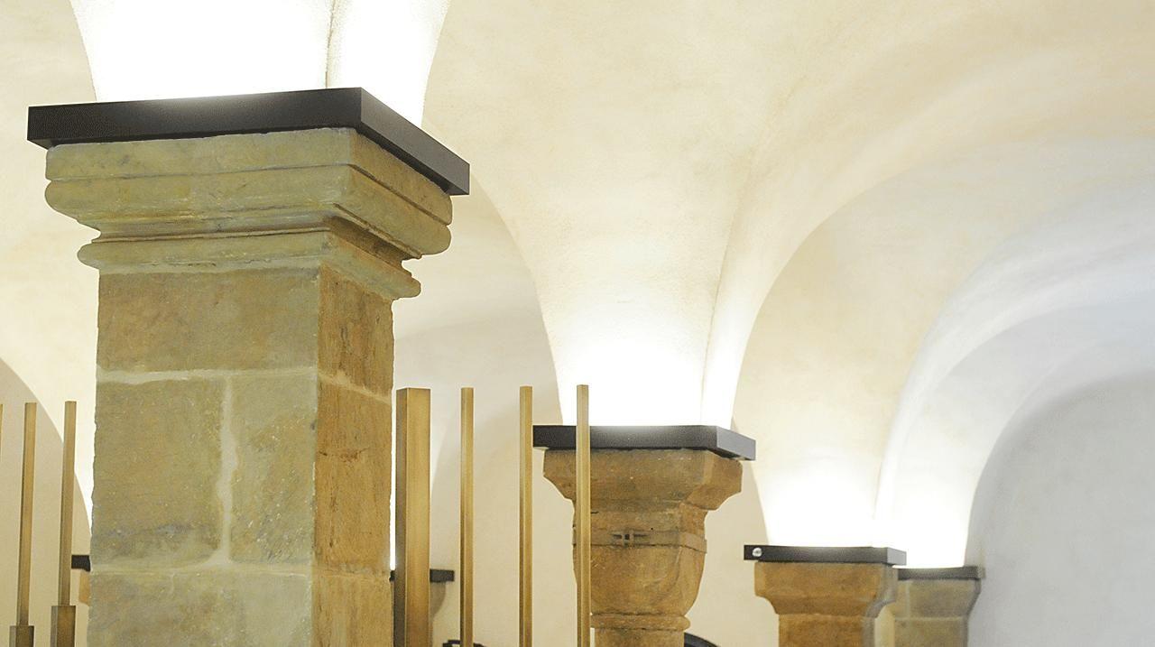 Denn die Krypta besteht eigentlich aus zwei Räumen. Wenn einen jemand darauf aufmerksam macht, sieht man es auch: Die Säulen sind im hinteren, dem Gottesdienstraum anders als vorn. Vorn ist eine Art Eingangsbereich. Man kommt die Treppe hinunter, dann geht es auf der einen Seite zum Gottesdienstraum und auf der anderen zur Grablege der Bischöfe. Das wiederum ist ein Bereich, den man schon jetzt und womöglich zukünftig gar nicht mehr unbefangen betreten kann. Denn hier sind die Kardinäle Degenhardt und Jaeger beerdigt. Noch ist die Missbrauchsstudie für das Erzbistum Paderborn nicht veröffentlicht, aber schon jetzt ist klar, dass sie beide in ihren Amtszeiten Missbrauch vertuscht und Täter geschützt haben. Damit muss man umgehen, und das Domkapitel hat dazu gemeinsam mit der Betroffenen-Vertretung eine Lösung gefunden.