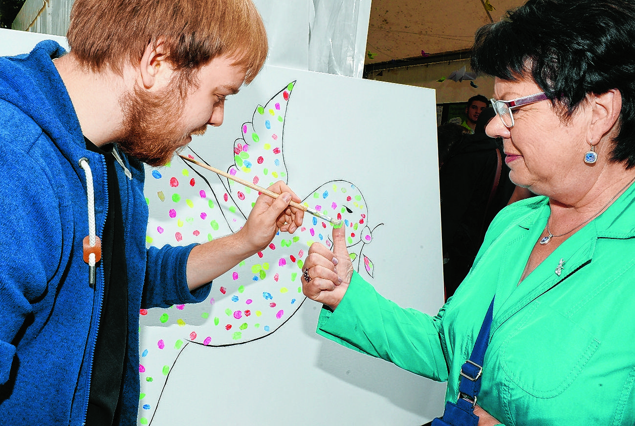 Mechthild Sellemerten aus Mastholte gehört zu den Katholikentagsbesuchern, die mit bunten Fingerabdrücken eine Taube entstehen lassen. Foto: Wiedenhaus