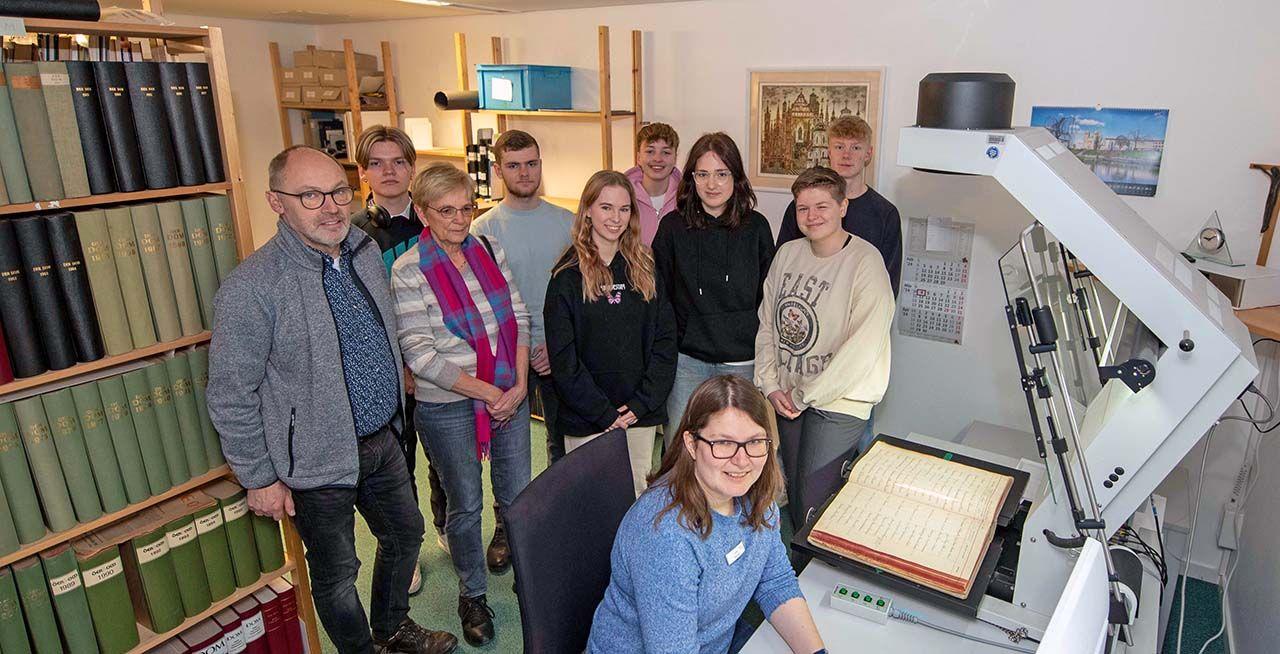 „Die Arbeit in einem Archiv ist spannend und vielfältig“, warb Archivarin Julia Hennig für ihren Beruf gegenüber den Schülerinnen und Schülern der St. Michael Realschule und des St. Michael Gymnasiums, die gemeinsam mit ihren Lehrkräften das Archiv besuchten. „Altes und Historisches trifft in unserem Erzbistumsarchiv auf die Technik der heutigen Zeit“, erklärte die Mitarbeiterin des Erzbistums Paderborn. Handschriftlich ausgestellte Urkunden oder wertvolle Siegel, aber auch Kirchenbücher müssen bewahrt werden, so dass sie auch zukünftigen Generationen zur Verfügung stehen. Bei der Digitalisierung von Schriftgut kommt hochmoderne Technik zum Einsatz.