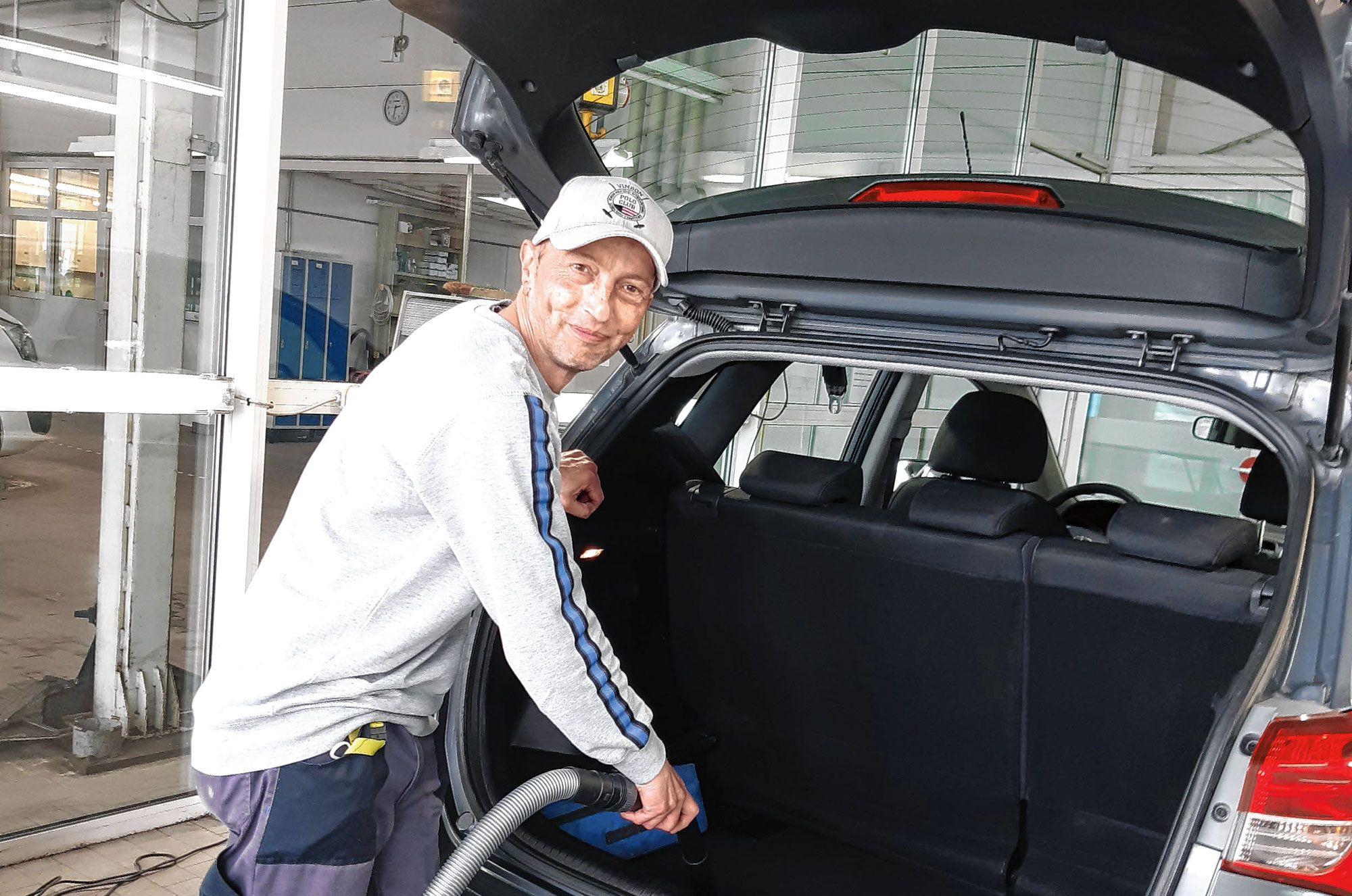 Freude an der Arbeit dank Teilhabechancengesetz. Guido Menzel bei seiner neuen Arbeit als Fahrzeugreiniger bei „check and snack“ in Sundern. (Foto: cpd)