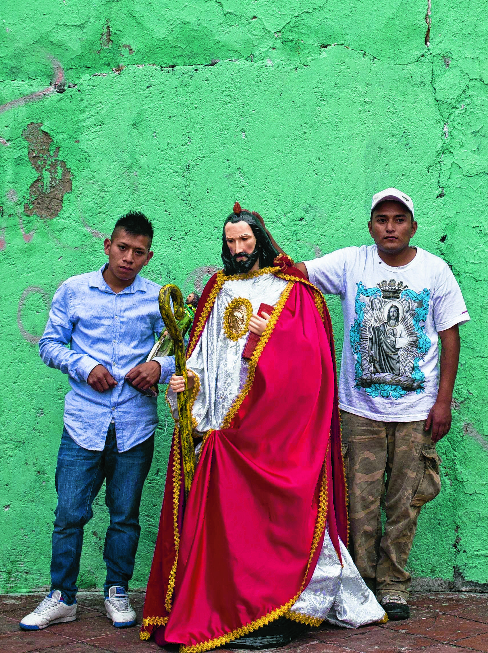 So etwas gibt es wohl nur in Mexiko: zwei junge Männer neben einer lebensgroßen Statue des Judas Thaddäus. Foto: dpa