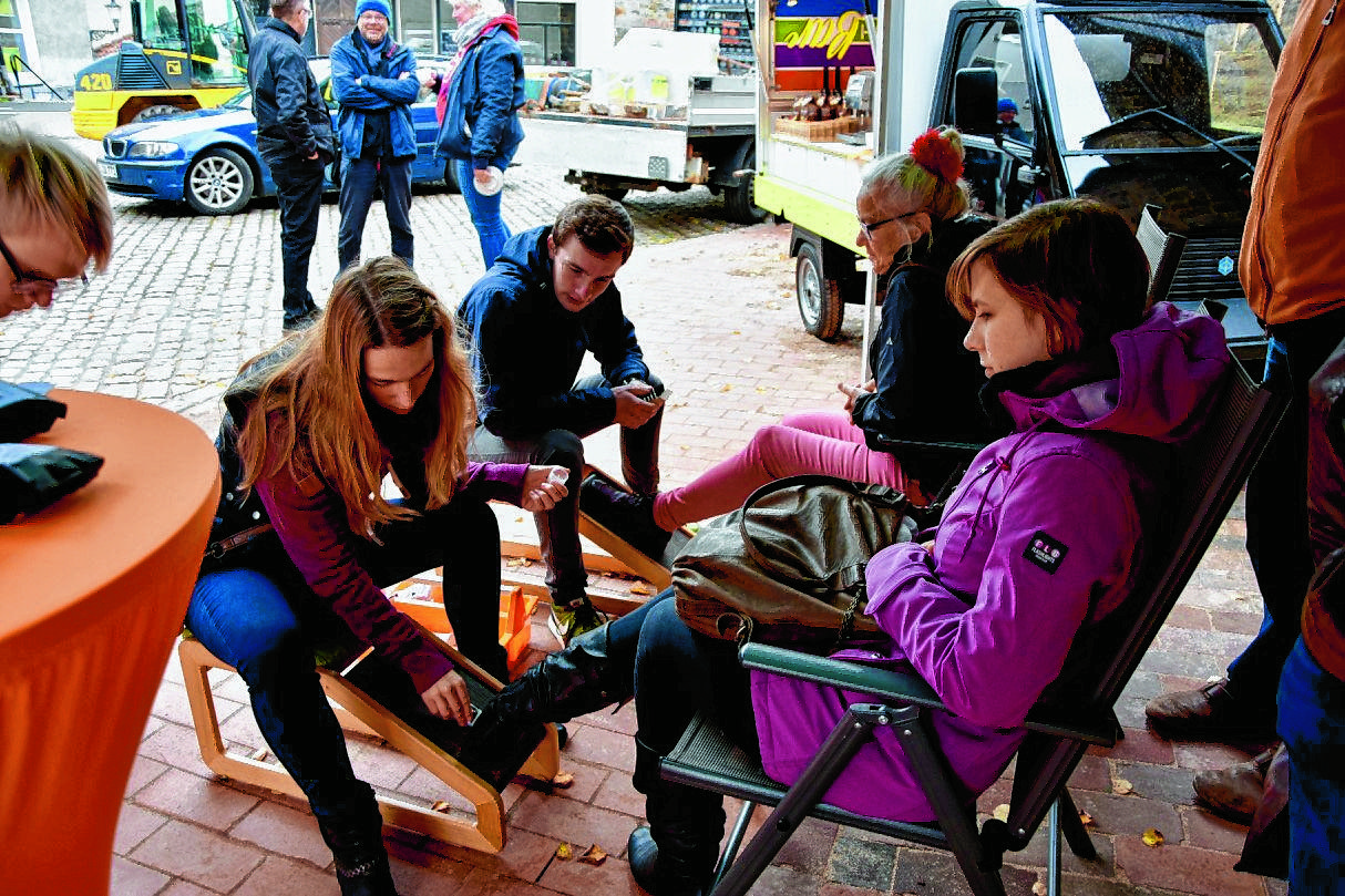 Die zwei klassischen Schuhputzhocker und das Material hatte ein Mindener Schuhgeschäft zur Verfügung gestellt. Die Jugendlichen bauten zudem einen kleinen Infostand auf. Bei einer Tasse fair gehandeltem Kaffee kamen Interessierte schnell miteinander ins Gespräch.