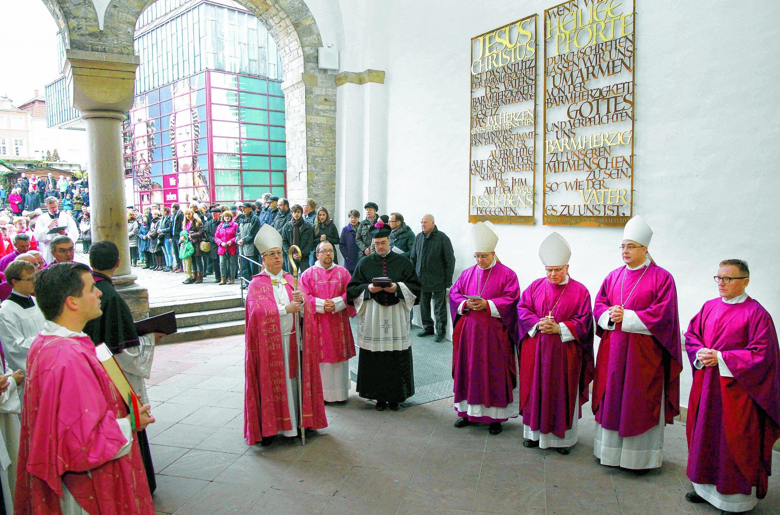 Nach einer Prozession von der Gaukirche zum Hohen Dom versammelte sich die Gottesdienstgemeinde am Paradiesportal des Hohen Domes, wo Erzbischof Hans-Josef Becker (Mitte) die Heilige Pforte öffnete.