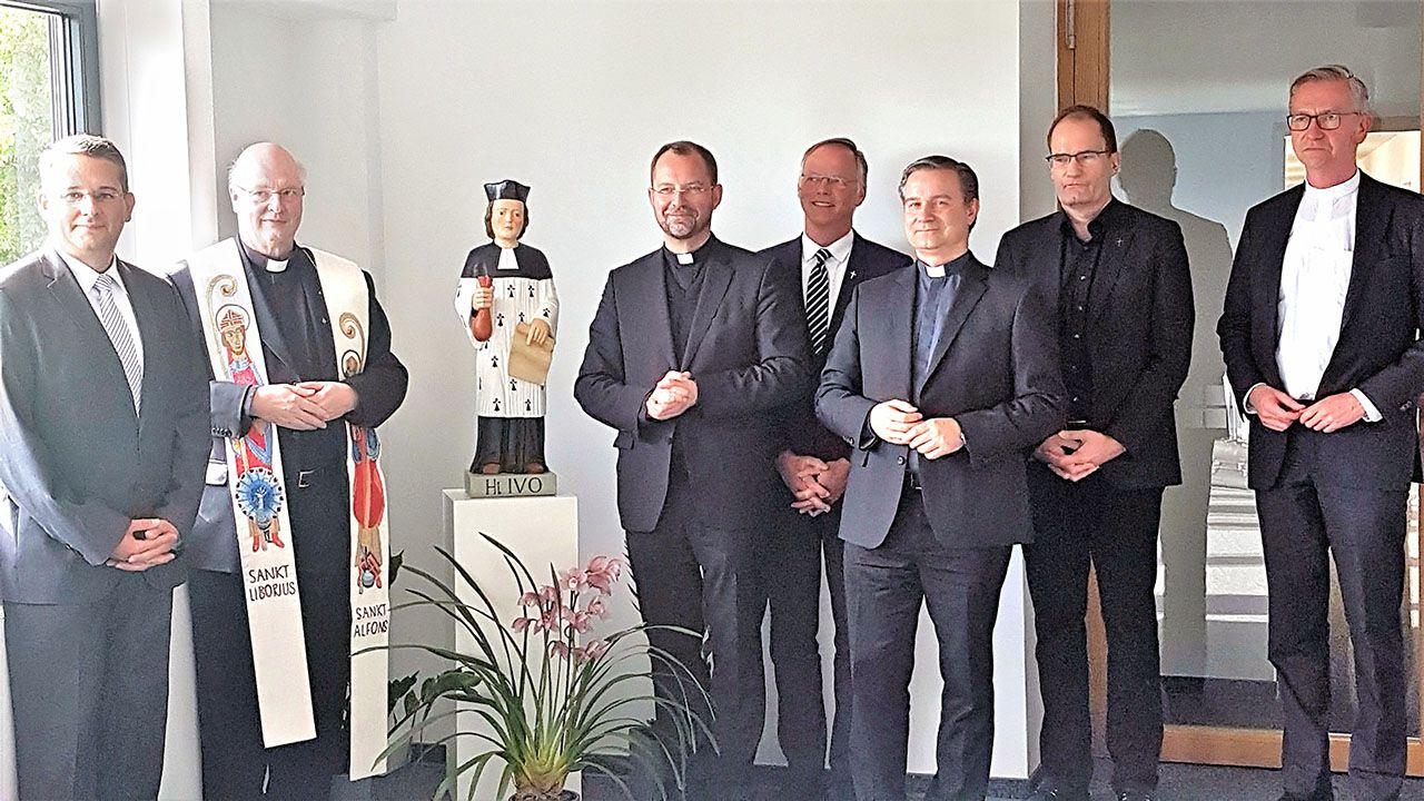 Eine Begegnung der fünf NRW-Generalvikare, von der es ein Foto gibt. 2019 trafen sie sich im katholischen Datenschutzzentrum in Dortmund, wo Alfons Hardt (2. v. l.) eine Statue des heiligen Ivo segnete. Außer ihm nahmen teil (von links): Steffen Pau (Leiter des Katholischen Datenschutzzentrums), Generalvikar Dr. Andreas Frick (Aachen), Generalvikar Dr. Klaus Winterkamp (Münster), Dr. Markus Hofmann (damals Generalvikar in Köln), Generalvikar Klaus Pfeffer (Essen) und Dr. Antonius Hamers (Katholisches Büro). (Foto: Katholisches Datenschutzzentrum)