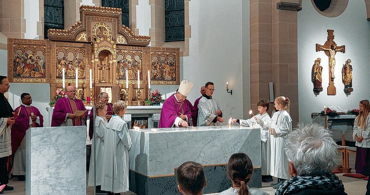 Die erfolgreiche Renovierung sei ein Werk des Kirchenvorstandes, betonte Pfarrer Leber. „In Zeiten, in denen Pastöre große Räume zu versorgen haben, müssen sich Leute in den Gemeinden für solche Projekte starkmachen, sonst wird das nichts.“ Konzelebranten am Altar waren Vikar Jai, Pfarrer Dieter Koke, Diakon Paul-­Georg Bartscher, Pfarrer Markus Leber und Pfarrer Thomas Hengstebeck. Während des Pontifikalamtes wurden zunächst Reliquien des Heiligen und Märtyrers Paulinus von Trier beigesetzt. Dann folgte die Besprengung des neuen Altares mit Weihwasser, die Salbung und die Verbrennung von Weihrauch. Dabei wurde der Weihbischof von Messdienern aus Saalhausen unterstützt. So durfte Julian auf den Bischofsring aufpassen, den der Bischof wegen der Salbung des Altares abgenommen hatte und vier Messdienerinnen und Messdiener halfen beim Anzünden des Weihrauchs. „Ein einziges Mal dürft ihr in der Kirche jetzt zündeln, dann nicht mehr“, gab der Weihbischof ihnen lächelnd mit auf den Weg.