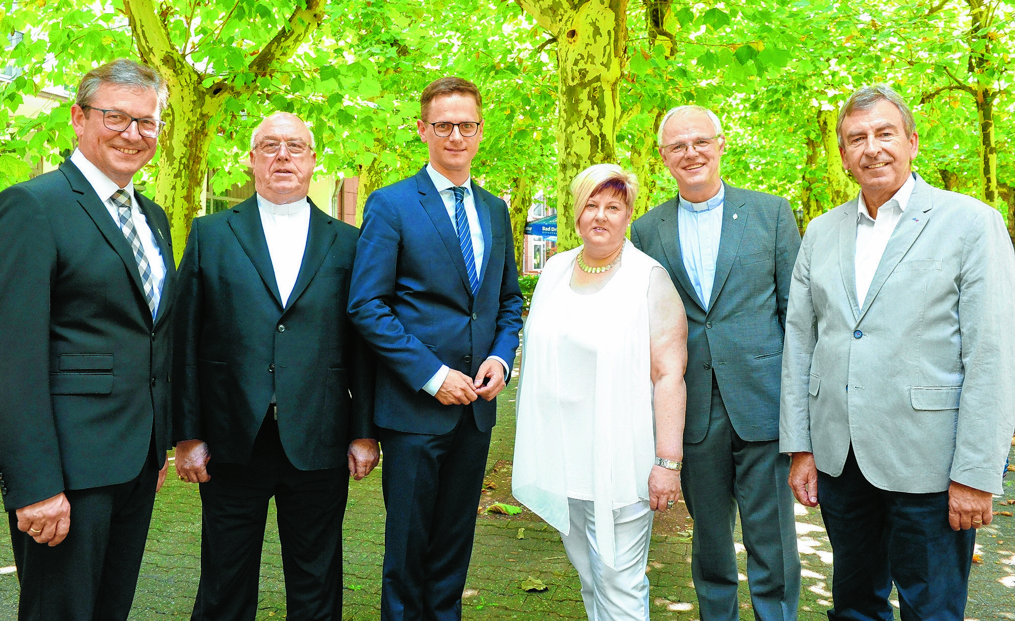 Landvolkkundgebung zu Libori (v. l.): Paderborns Bürgermeister Michael Dreier, Erzbischof Hans-Josef Becker, Dr. Carsten Linnemann MdB, Kornelia Wagner (Bezirksvorsitzende Westfälisch-Lippischer Landfrauenverband in OWL), Monsignore Uwe Wischkony (Direktor der Landvolkshochschule Hardehausen) und Landrat Friedhelm Spieker (Kreis Höxter). Foto: Wiedenhaus