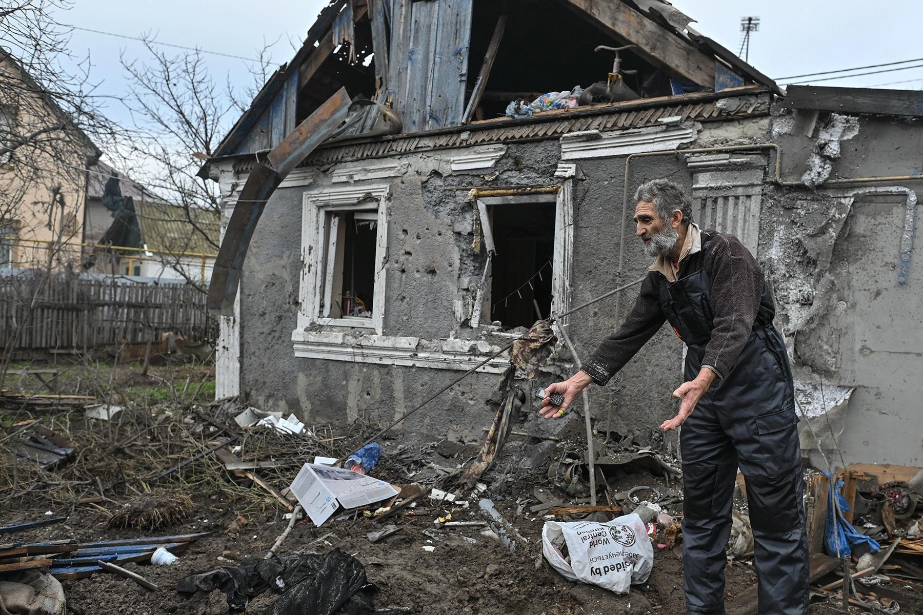 Cherson: Ein Mann zeigt die Einschlagsstelle einer Rakete, die seinen Nachbarn, einen Vater von zwei Kindern, tötete. Die Stadt ist zwar befreit, wird aber noch immer täglich beschossen.