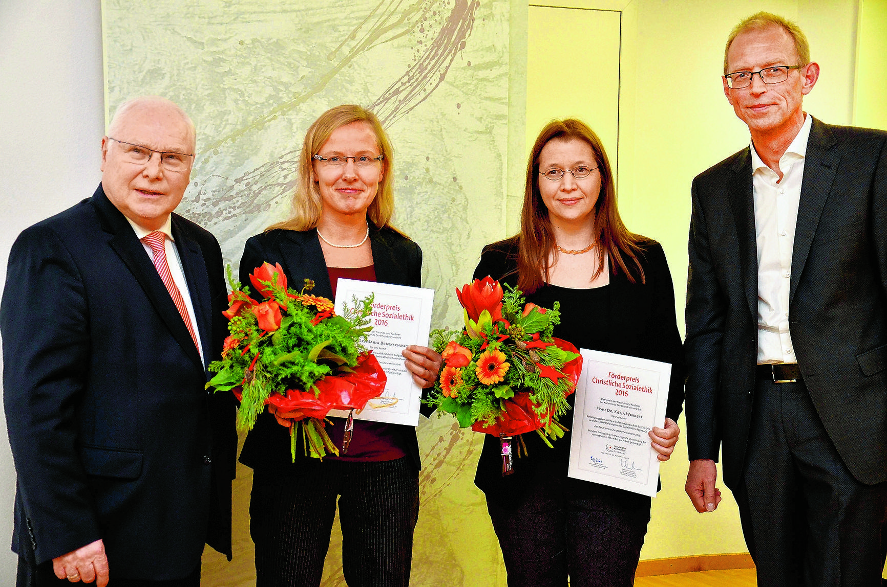 Auf dieses Ziel ist auch die Christliche Sozialethik ausgerichtet. Zwei junge Wissenschaftlerinnen wurden für ihre Arbeiten in diesem Bereich ausgezeichnet. Der jeweils mit 1 000 Euro dotierte „Förderpreis Christliche Sozialethik 2016“ ging an Dr. Katja Winkler und Dr. Maria Brinkschmidt.