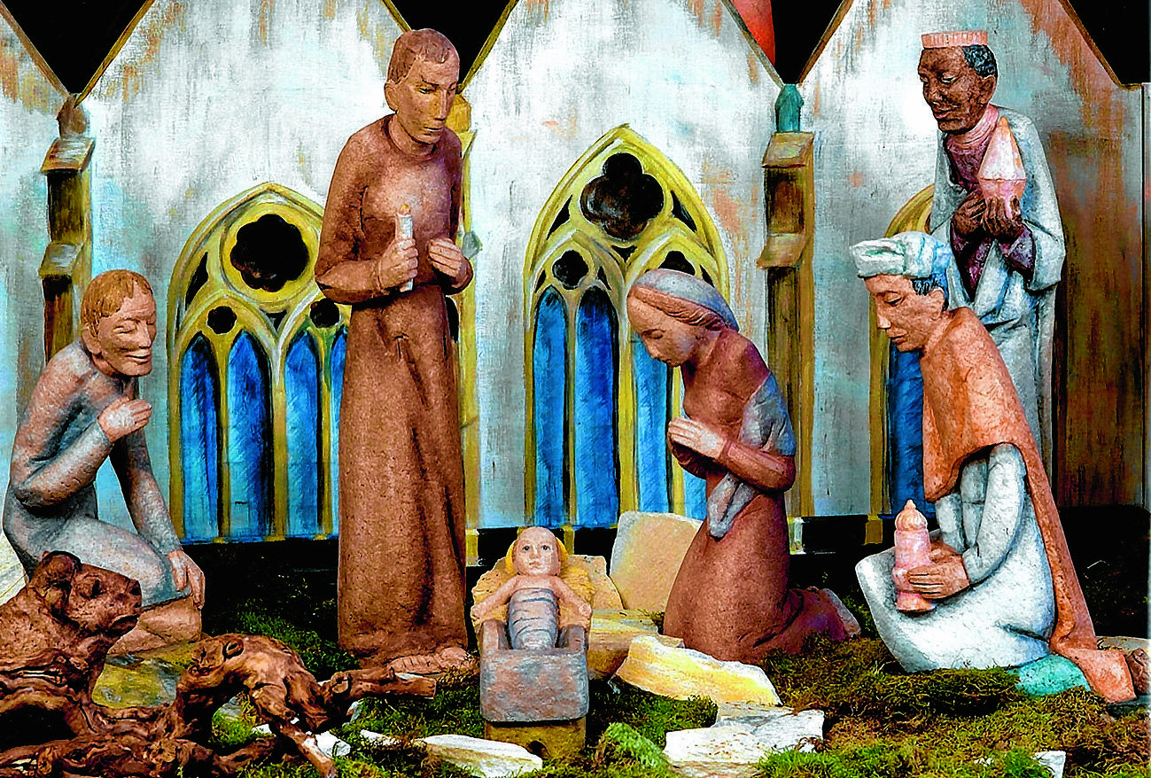 Diese Krippe von Gustav Hagelstange entstand nach dem Krieg für den Paderborner Dom. Ausgezehrte Menschen und ein Jesuskind, das den Besuchern freudig die Arme entgegenstreckt. Foto: Heine-Hippler