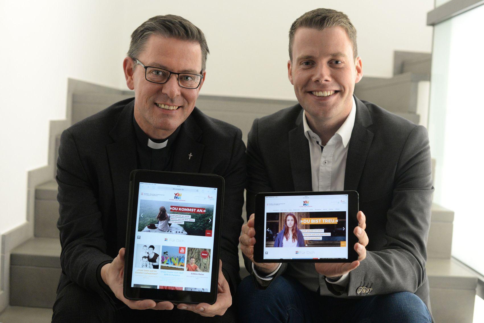 Diözesanjugendpfarrer Stephan Schröder (links) und der verantwortliche YOUPAX-Redakteur Dirk Lankowski präsentieren das neue innovative Glaubensportal YOUPAX des Erzbistums Paderborn – optimiert für alle Endgeräte.