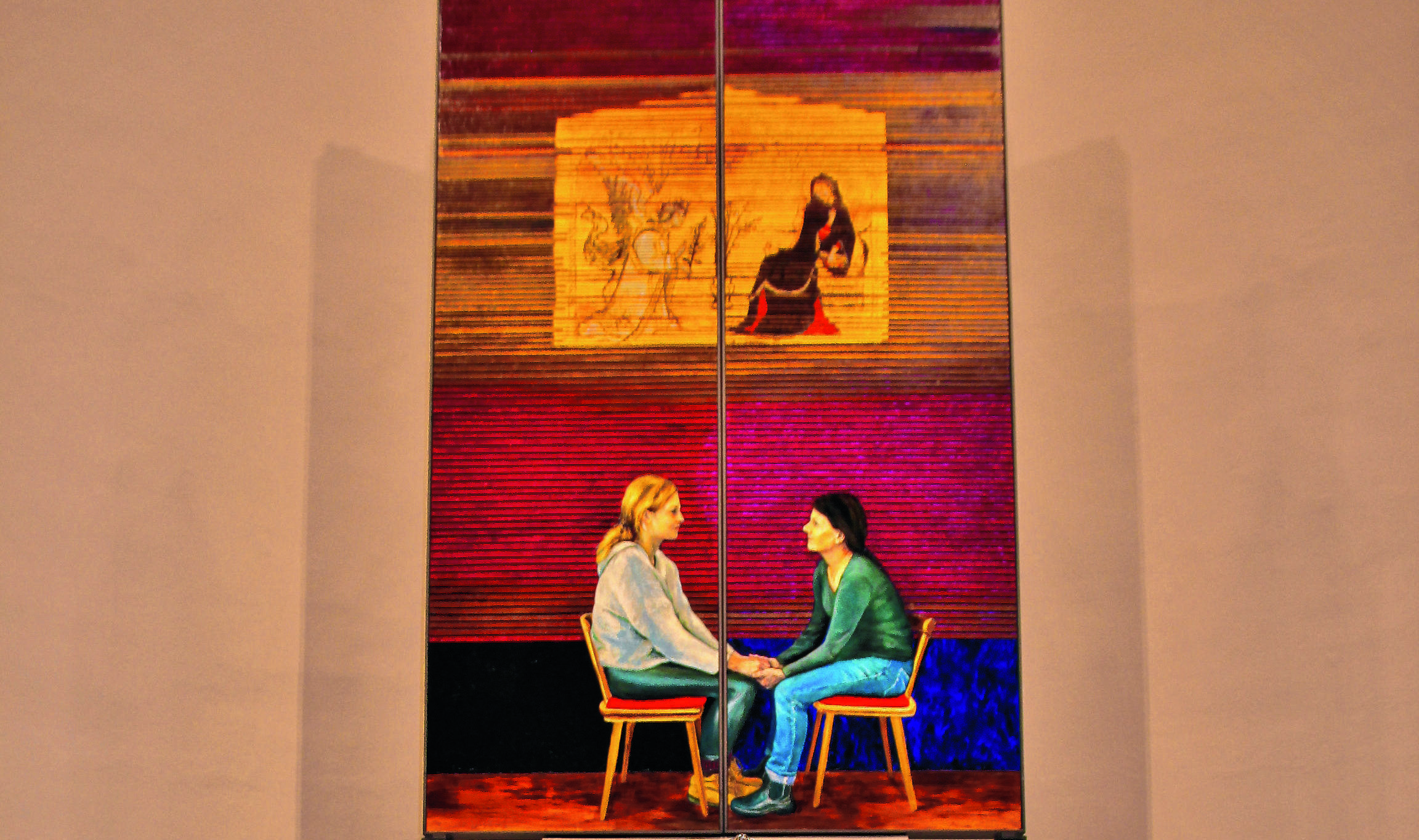 Der Esloher Künstler Thomas Jessen erklärte, das Bild des zugeklappten Flügelaltars zeige die Verkündigung. Im oberen Teil lehnte er sich an das Verkündigungsbild des italienischen Malers Simone Martini (*1284 in Siena, †1344 in Avignon) an. Das untere Bild zeigt zwei Frauen, die sich gegenseitig anschauen. „In dieser Kontemplation spielt sich der Gedanke der Fasten- und Bußzeit ab“, sagt Jessen. „Das klassisch-traditionelle und feministische Thema Verkündigung zeigt Maria bei ihrer Kusine Elisabeth.“