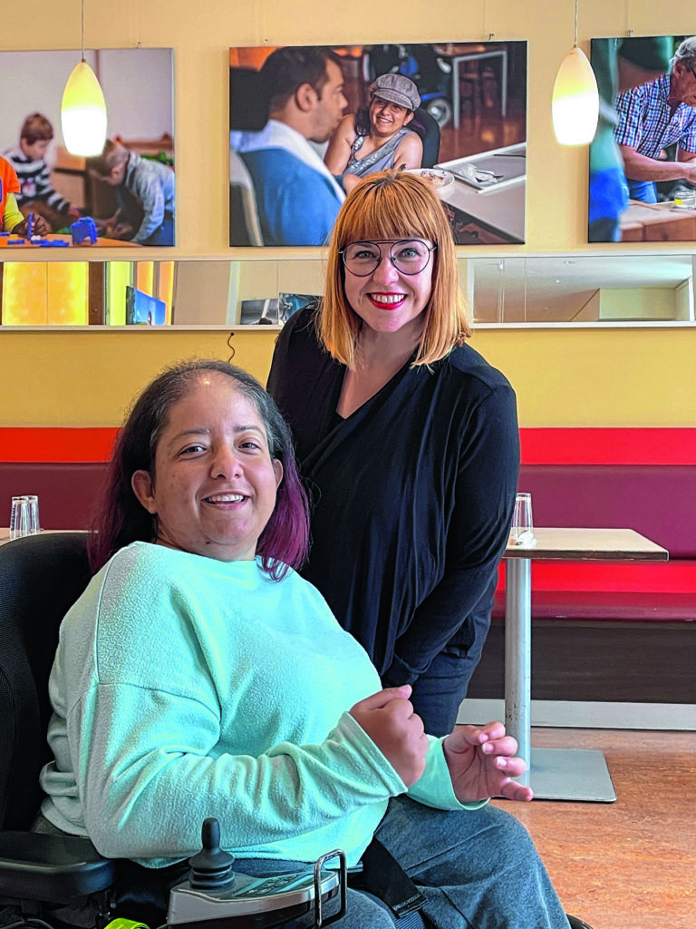 Sabrina Voss mit einem ihrer "Foto-­Models" im Café Sonnenblick, im Hintergrund das ausgestellte Foto. (Foto: Josefsheim)