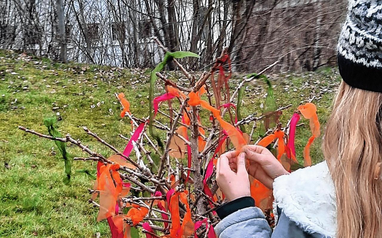 Die Gottesdienstbesucher waren anschließend eingeladen, ihre Hoffnungen, Wünsche und Gebete mit einem Band in den Baum zu binden. Dieser hat seinen Platz oberhalb der Kirche inmitten der Kreuzwegstationen gefunden. Weitere Bänder liegen im Kircheneingang bereit und können an den Baum gebunden werden.