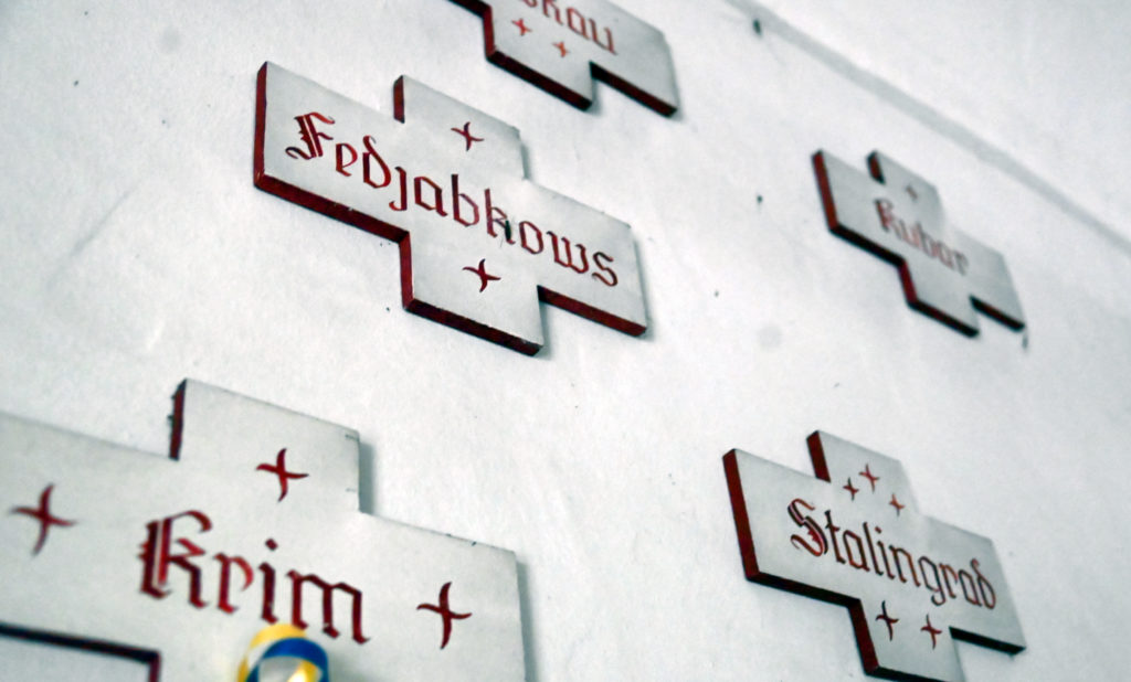 Die Wände der Friedenskapelle sind versehen mit kleinen Tontafeln. Darauf zu lesen sind Ortsnamen, die sich tief ins kollektive Gedächtnis nicht nur der Deutschen, sondern auch der anderen Kriegsparteien eingebrannt haben: Verdun, Stalingrad, Narvik, Sedan, Ysselstein, Krim, el-Amain. Sie stehen für Schlachtfelder, Verbrechen an der Menschlichkeit und Massengräber. Auf jedem Täfelchen befindet sich eine Anzahl von Kreuzen: Sie stehen für die Anzahl der Gefallenen. Der Ort Elleringhausen zählte auch damals nur ein paar Hundert Einwohner, 41 davon verloren im Zweiten Weltkrieg ihr Leben, eine ungewöhnlich hohe Zahl. Eine Familie verlor sogar vier von sechs Söhnen; das steht auf einer der beiden Sterbetafeln links und rechts vom Altar. Heute wird die Kapelle von der Dorfgemeinschaft gepflegt. Seit Jahren sorgt ein Ehepaar aus dem Dorf auf dem Ruthenberg für frische Blumen; auch sie haben Verwandte im Krieg verloren.