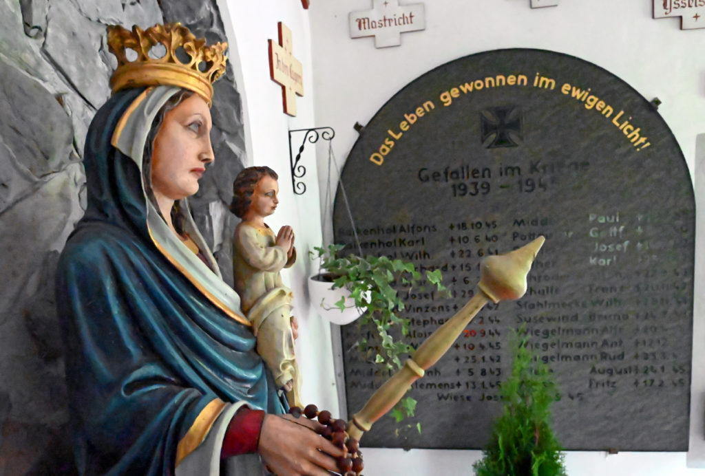 Maria war für die trauernden und dankbaren Männer die „Königin des Friedens“, weshalb sie diesen Titel auf die Wand über dem Altar malten. Ein paar Worte fanden die Männer dann auch noch. Am Eingang steht auf Plattdeutsch geschrieben: „Wir Heimkehrer und eine Menge ‚Gutwilliger‘ bauten der ‚Mutter Gottes vom guten Frieden‘ zum Danke dieses Kapellchen im Sommer 1967“.