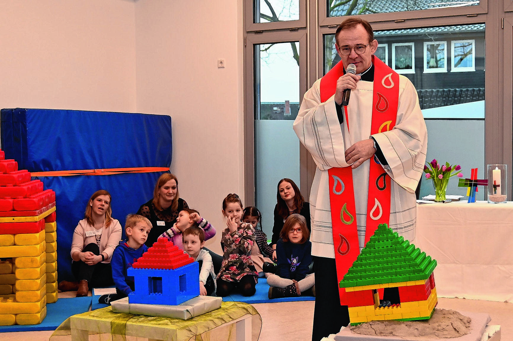 Im Wortgottesdienst wurde deutlich, dass man kein Haus auf Sand, sondern auf einem festen Fundament gebaut hat. „Das Haus ist fertig, jetzt müsst ihr mit euren Steinen weiterbauen“, betonte Pfarrer Zander. Die Steine würden Namen tragen wie Liebe, Hoffnung, Freude, Lachen, Freundschaft und Frieden. Er segnete im Anschluss zusammen mit den Kindern alle Räume und bat Gott um seinen Segen für die Menschen, die dort ein- und ausgehen. Mit einem Tag der offenen Tür für alle Interessierten wurde die Einweihung im Anschluss gefeiert.