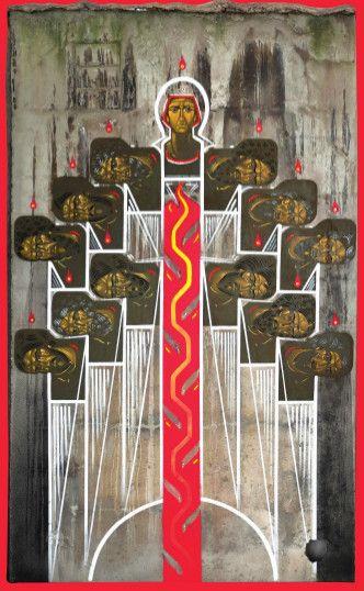 Das Motiv auf dem Gebetszettel zeigt 13 Köpfe, die wie eine Art Stammbaum einander zugeordnet sind. In der Mitte, gewissermaßen der Stamm, wächst eine Flammensäule, die Köpfe sind durch weiße Zacken miteinander verbunden. Der Untergrund Beton ist unverkennbar. Über allen Köpfen schweben winzige kleine Flammen. Die Gesichter, es sind die von Maria und der zwölf Apostel, zeigen nach Ikonenart keine Emotion, was für den westlichen Betrachter immer ein bisschen streng wirkt. Vor allem Maria blickt einen fast verhärmt an.