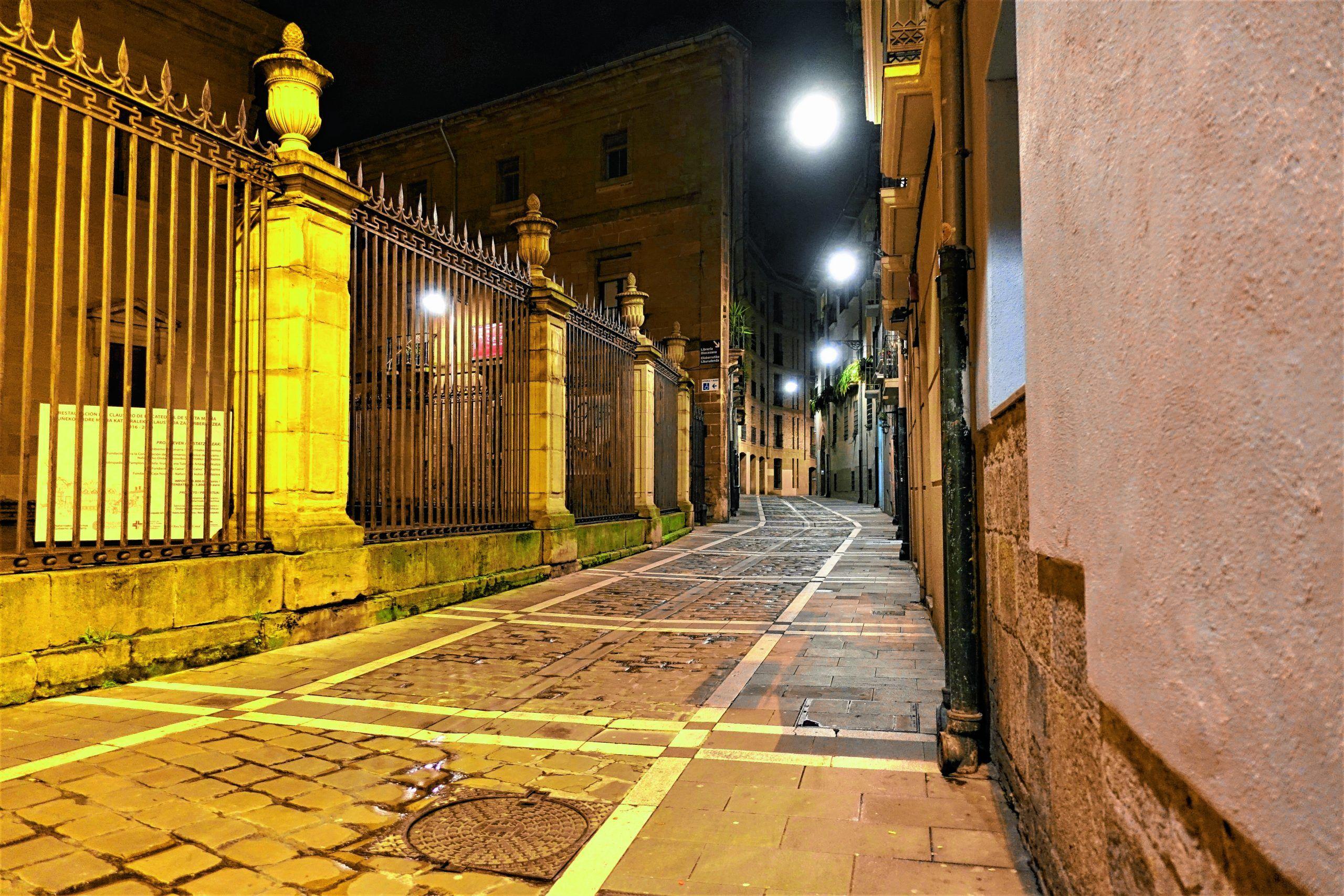 In dieser Gasse, die an den Absperrgittern der Kathedrale von Pamplona entlangführt, finden sich sonst viele Jakobspilger ein. Foto: Drouve