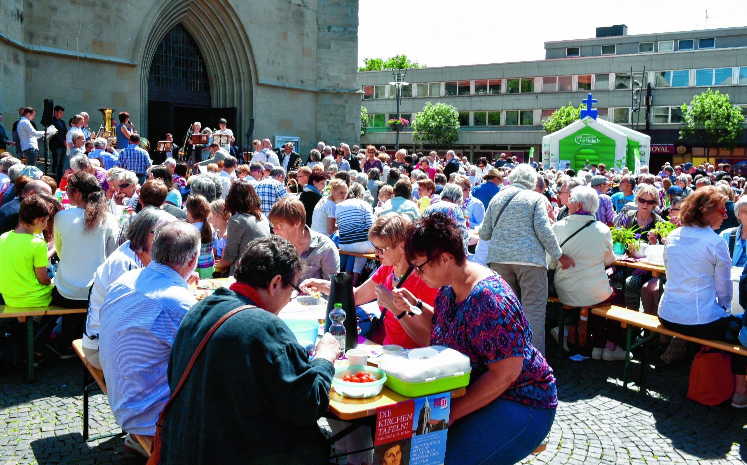 Nach dem Gottesdienst fanden sich auf dem Marktplatz vor der Kirche die 500 angemeldeten Teilnehmer an den vorbereiteten Tischgruppen ein, um gemeinsam ihre mitgebrachten Speisen zu verzehren. Oberbürgermeister Hunsteger-Petermann eröffnete mit seinem Grußwort die fröhliche Tafel und brachte die Abwägung von Verbindendem und Unterschiedlichkeiten auf einen Nenner: „Wir treffen uns an diesem Tag als Gemeinschaft von Christen, die sich zu Gott bekennt. Gott ist stärker als alles, was Menschen und Religionen trennt.“