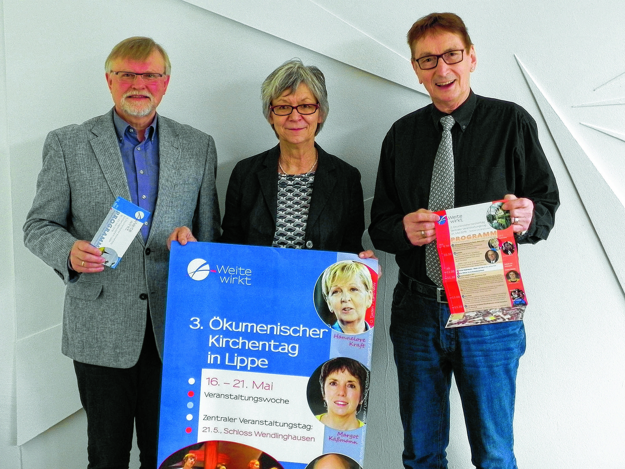 Präsentieren die Plakate und Programm-Flyer des ökumenischen Kirchentages in Lippe (v. l.): Pfarrer i. R. Rolf-Joachim Krohn-Grimberghe, Pfarrerin Birgit Pötzsch und Kirchentagsgeschäftsführer Fritz Tibbe.