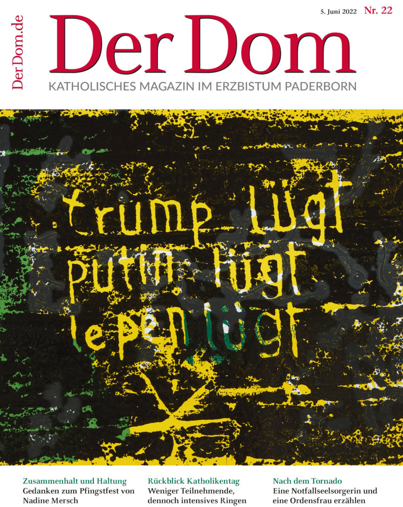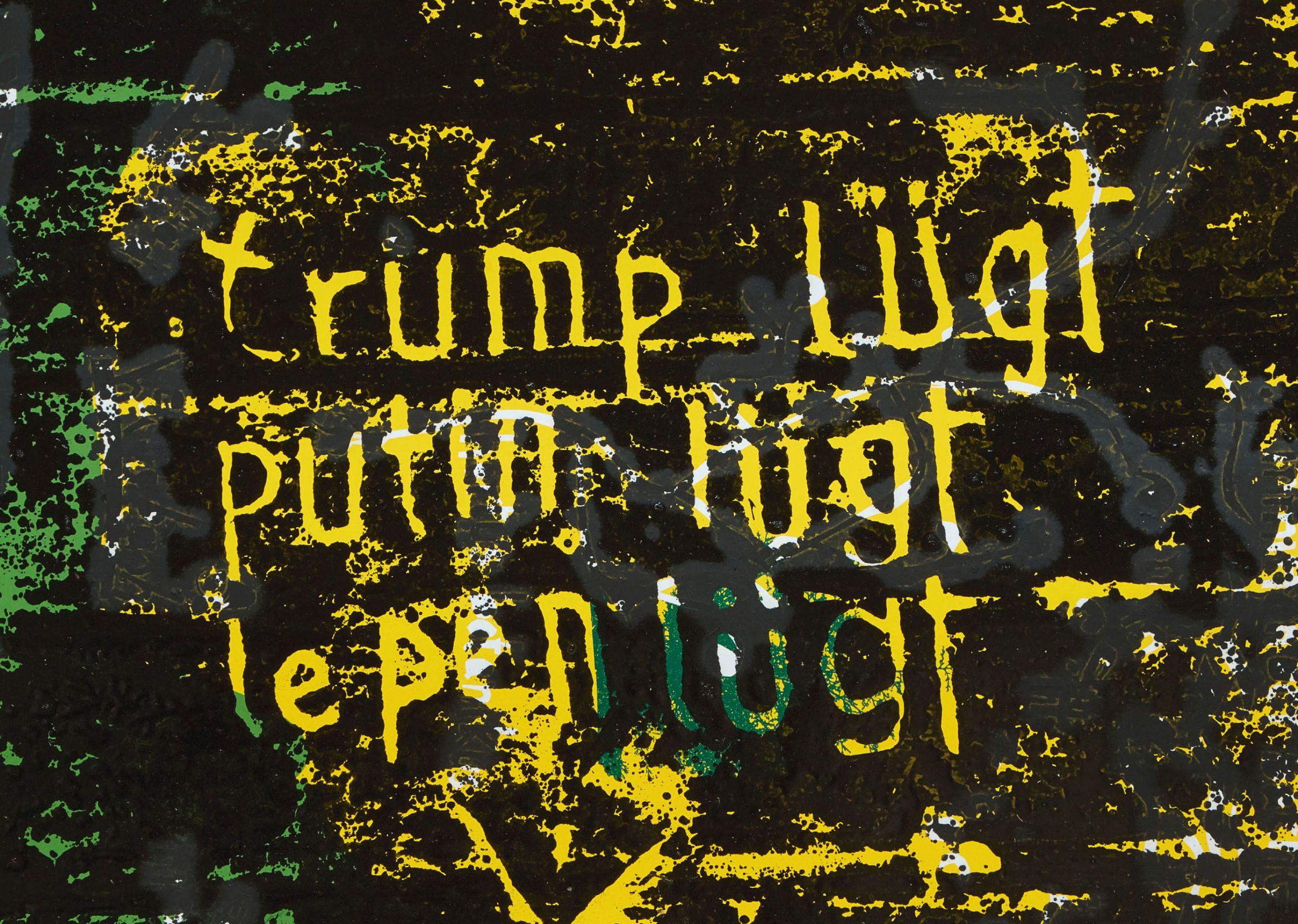 „Orakel Blatt“ heißt das Werk des Künstlers Felix Droese, das wir in dieser Ausgabe auf dem Titel haben. Ein Orakel ist eine Art Weis­sagung, die helfen soll, eine Entscheidung zu treffen. Droeses Weis­sagung ist nun – anders als etwa die des Orakels von Delphi – ziemlich eindeutig: „Trump lügt, Putin lügt, Le Pen lügt.“ Das Werk stammt aus dem Jahr 2017, das Jahr, in dem Trump Präsident wurde. Spätestens seitdem wissen wir, dass auch gefestigte Demokratien nicht davor gefeit sind, einen atemberaubenden Lügner an die Macht zu lassen. Ein zweites Beispiel ist wohl Großbritannien und im Osten Europas sehen wir gerade, wohin es führt, wenn nicht rechtzeitig eingegriffen wird: Die Lüge ist egoistisch, destruktiv und zerstörerisch. Sie ist der gerade Weg in den Abgrund. Die Lüge tötet.