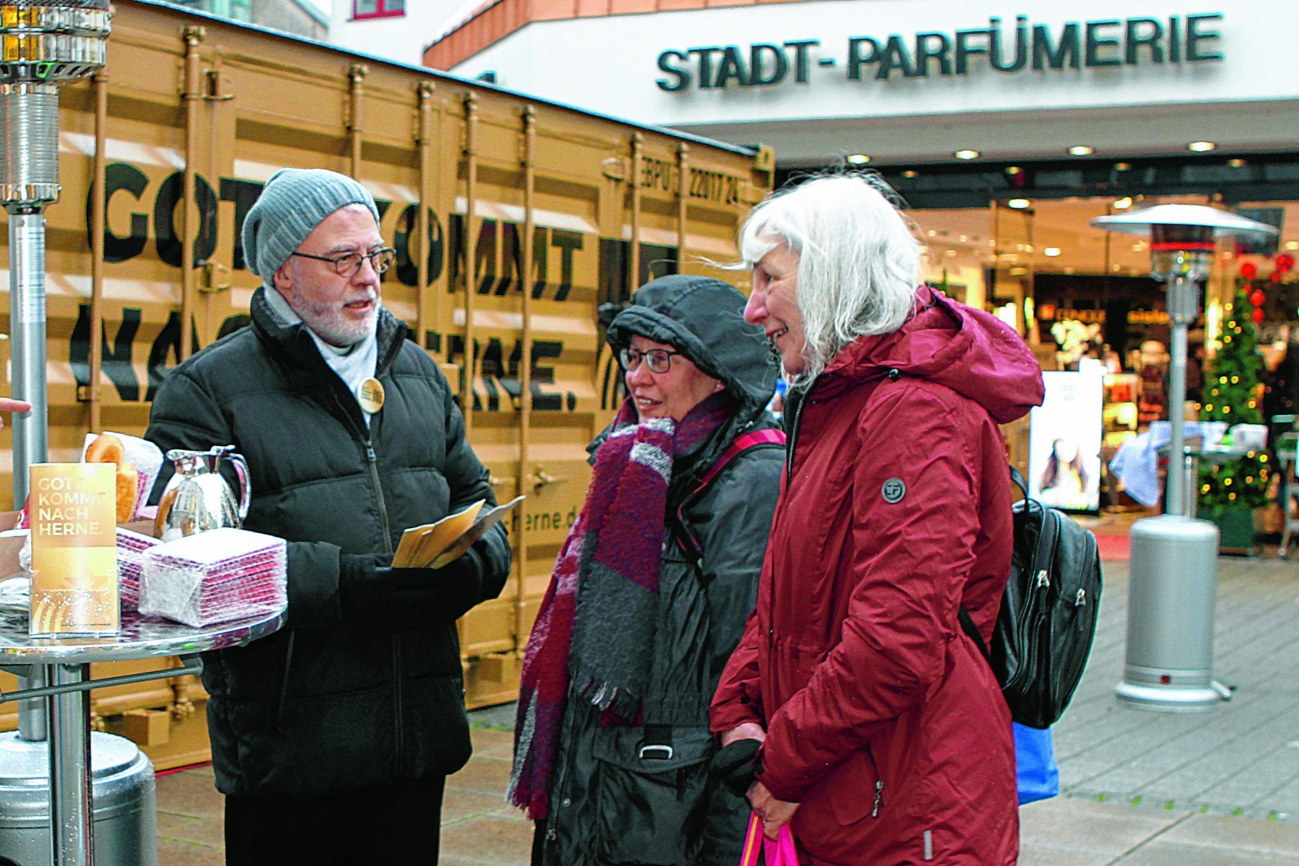 Um 14.00 Uhr erreicht Pastor Meinolf Mika den Container. „Zum Glück gibt’s den Segen“, heißt das Leitwort der nachmittäglichen Veranstaltung mit ihm. „Wir erinnern uns an die Wurzeln der Adventszeit und möchten dazu anregen, sie wieder bewusst wahrzunehmen“, so der Seelsorger. Kurze Zeit später entwickelt sich ein anregender Dialog zwischen ihm und einer Passantin. Das Gespräch endet mit den „Segen to go“.