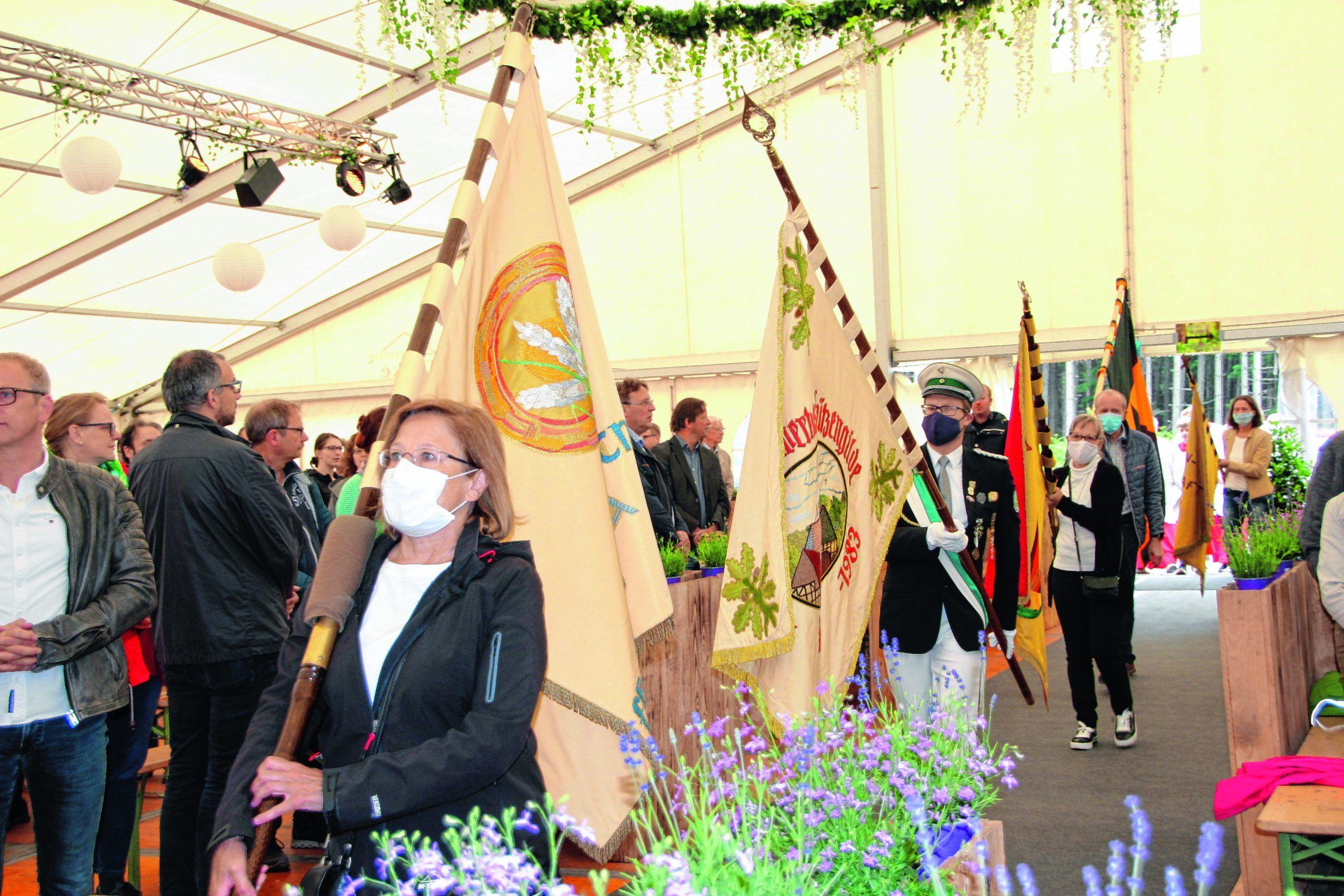 Wie bei einer Prozession zu Fronleichnam waren einige Fahnenabordnungen beim Gottesdienst im Biergarten dabei. Foto: Berenbrinker