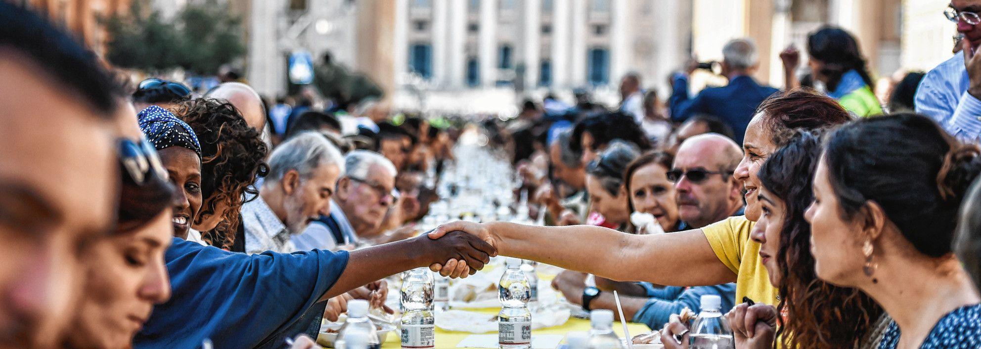 Die neue Rangordnung könnte „Nebeneinander“ lauten, wie hier in Rom. Der Verband christlicher internationaler Freiwilligendienste FOCSIV organisierte im Oktober vergangenen Jahres die römische Tafel ohne Mauern, die „Tavolata romana senza Muri“. 650 Menschen, darunter Flüchtlinge und andere Bedürftige, speisten mitei­nander auf der Straße zwischen Engelsburg und Petersplatz. Foto: KNA