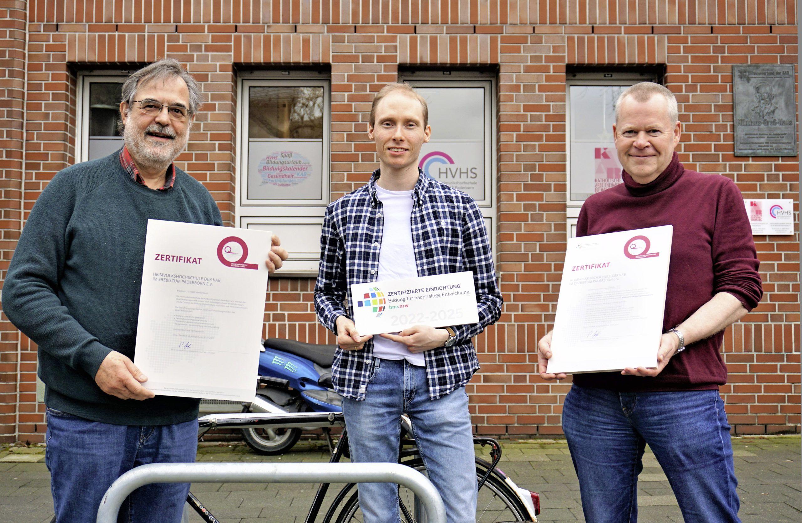 Hamm/Paderborn (pk). Viel Arbeit wurde von Erfolg gekrönt. Dem KAB-Diözesanvorsitzenden Konrad Nagel-Strotmann, dem Diözesansekretär und pädagogischen Leiter der HVHS, Ludwig Stratenschulte, sowie dem Qualitätsmanagementbeauftragten Benedikt van Acken war die Freude anzusehen, als sie im KAB-Büro in Hamm die erfolgreichen Zertifizierungen der Heimvolkshochschule der KAB verkündeten.