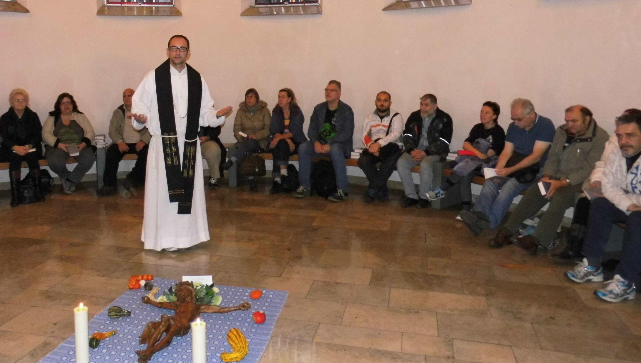 Wohnungslosenseelsorger Daniel Schwarzmann hält die Messe in einer Runde im Chorraum der Kirche. Foto: Czembor