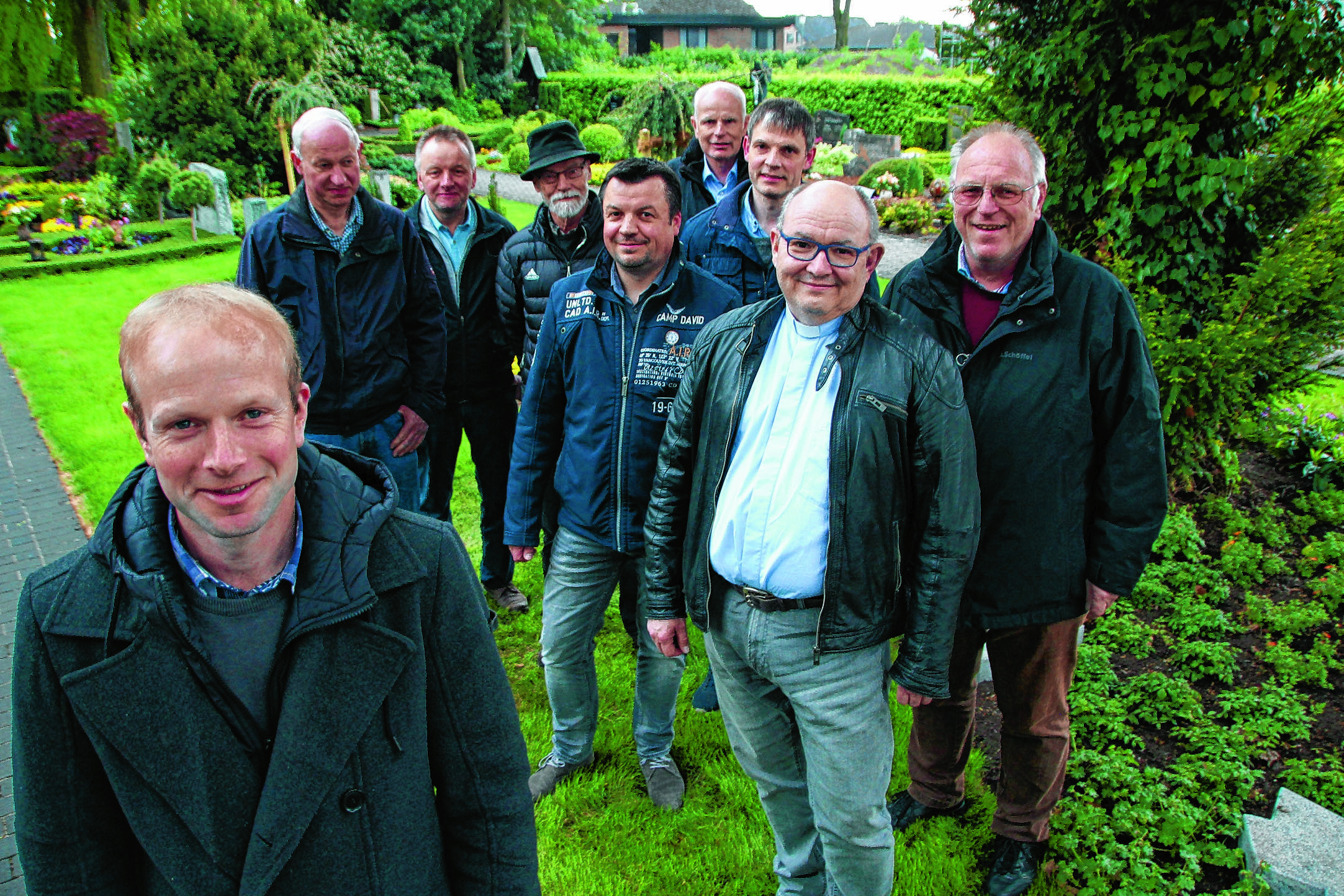 Friedhofsgärtner Marco Richert (l.) hatte die Idee für das neue Gräberfeld auf dem Kaunitzer Friedhof. Unterstützt wird er dabei von (v. l.) Martin Kaup, Norbert Polldavid, Ernst Nüst, André Hassenewert, Bruno Esken, Martin Kipshagen, Pfarrer Karl-Josef Auris und Dietmar Esken vom Kirchenvorstand.Foto: Berenbrinker
