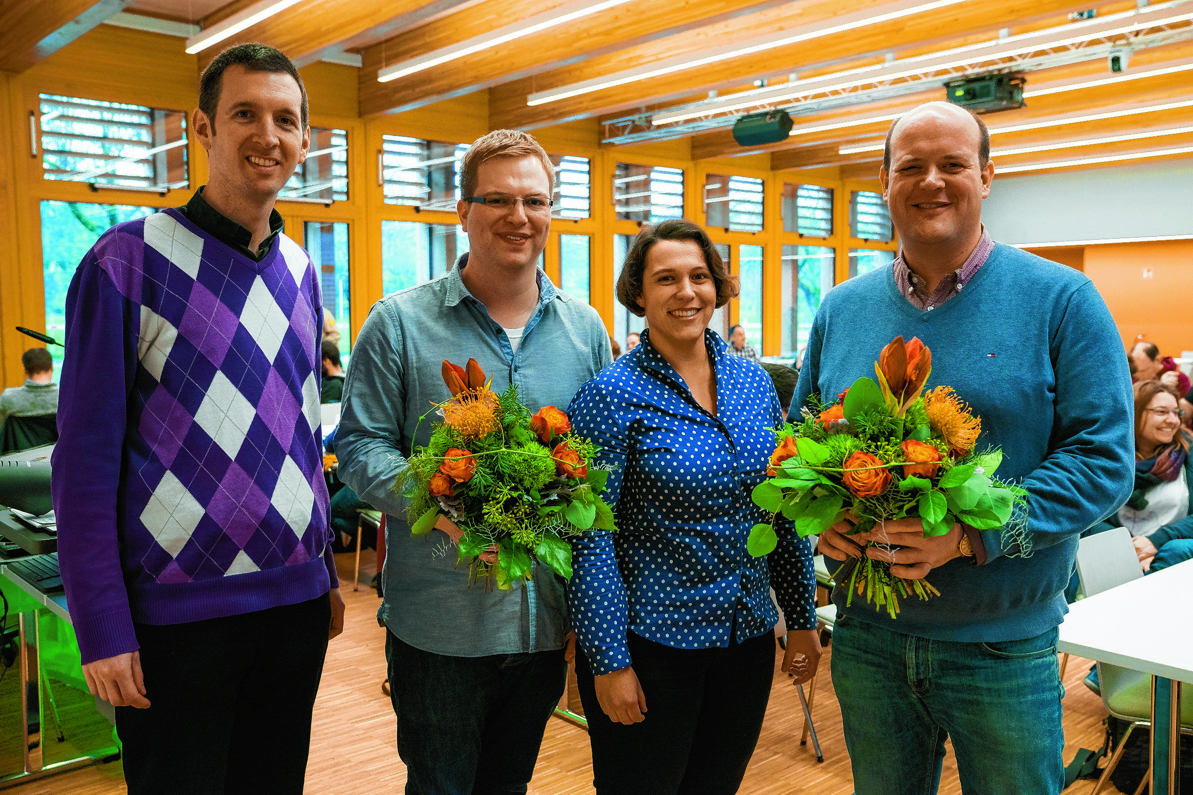 Jan Hilkenbach (2. v. l.) wird vom vorherigen Vorstand – Markus Wippermann (l.), Annika Manegold (2. v. r.) und Sebastian Koppers (r.) – im neuen Amt als Diözesanvorsitzender begrüßt. Foto: BDKJ/Eckert