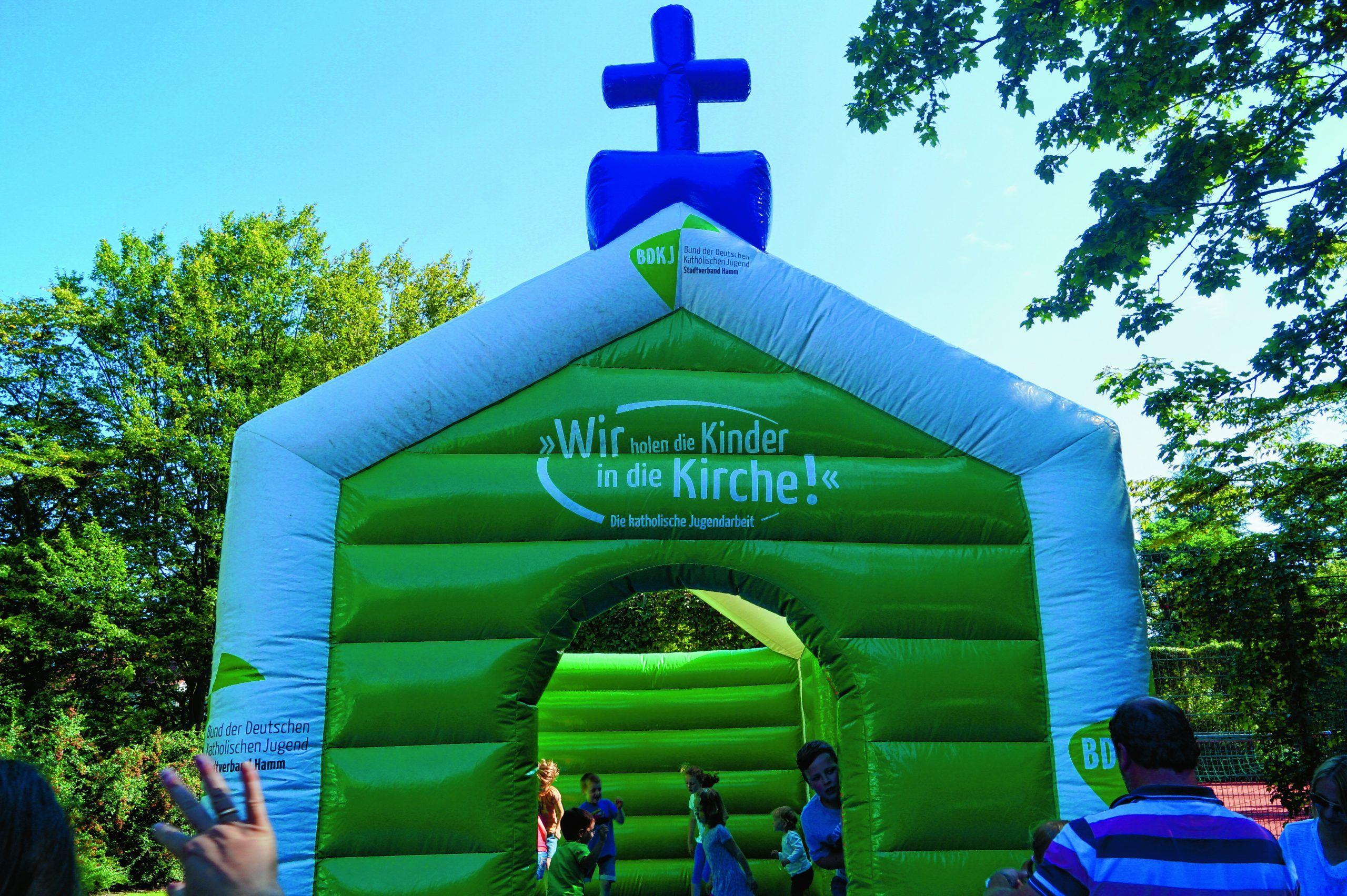 Der Pastoralverbund Hamm-Mitte-Osten, der BDKJ-Stadtverband Hamm sowie Sandra Schumacher vom St.-Franziskus-Berufskolleg hatten unter dem Motto „Minikirche im Maxipark“ zahlreiche Angebote vorbereitet: Den Auftakt bildete eine Segnungsfeier, die Gemeindereferentin Judith Temme kindgerecht durchführte. Nach liebevollen Worten und Musik wurde das nächste Ereignis von den Kindern gespannt erwartet: Sie beobachteten, wie die Hüpfkirche des BDKJ aufgeblasen wurde. Erst als das Kreuz über dem Eingang aufgerichtet war, wurde das Spielgerät eröffnet. Blitzschnell waren die Schuhe ausgezogen und die Kinder tobten sich aus.