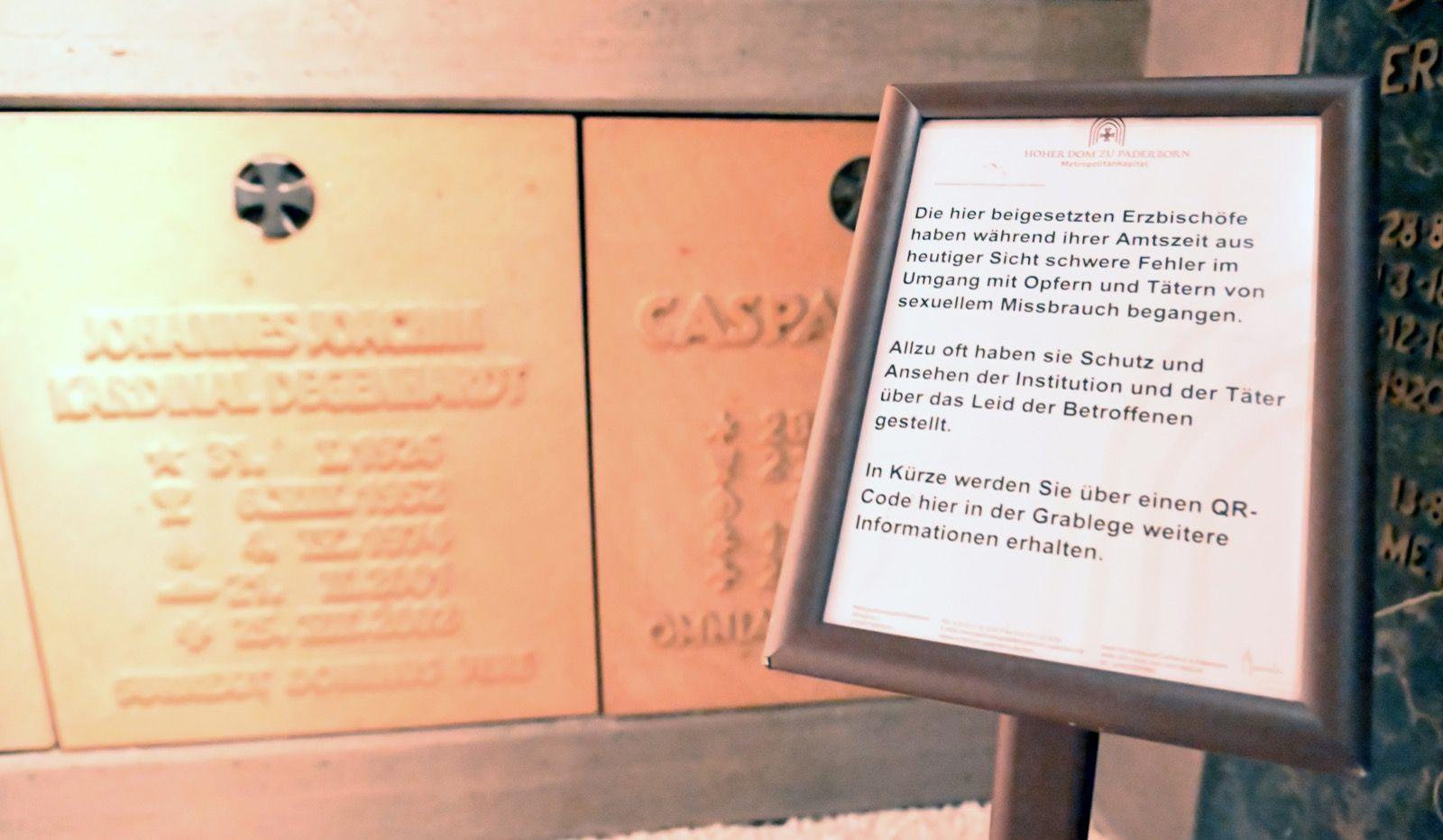 Seit der Wiedereröffnung der Krypta weist eine Tafel auf die Verfehlungen der dort bestatteten Erzbischöfe hin. (Foto: Patrick Kleibold)