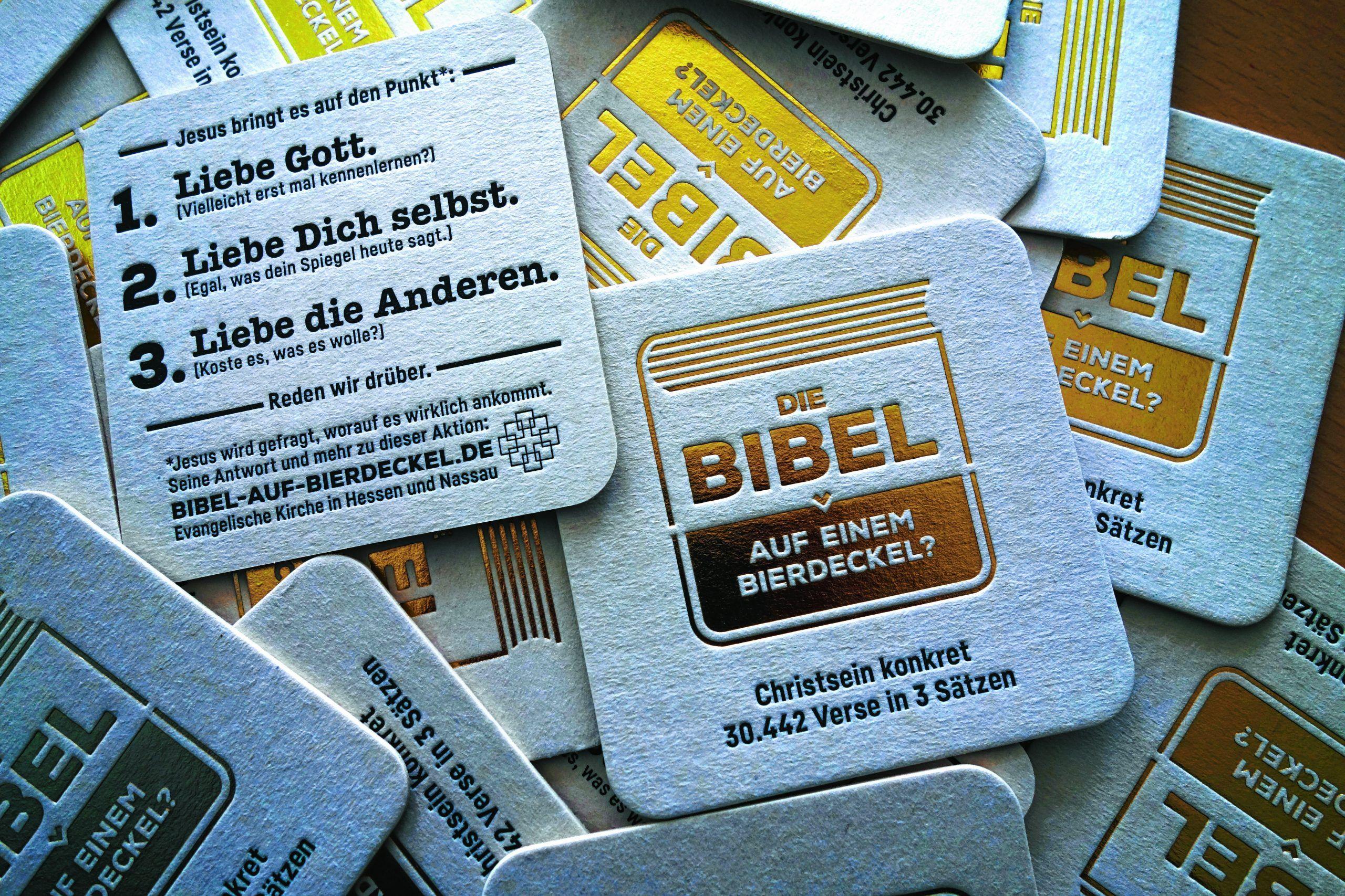 Mit dieser Aktion startete die Evangelische Kirche von Hessen-­Nassau 2016 ins Jahr des Reformationsgedenkens: die Bibel auf einem Bierdeckel. Foto: EKHN/gobasil