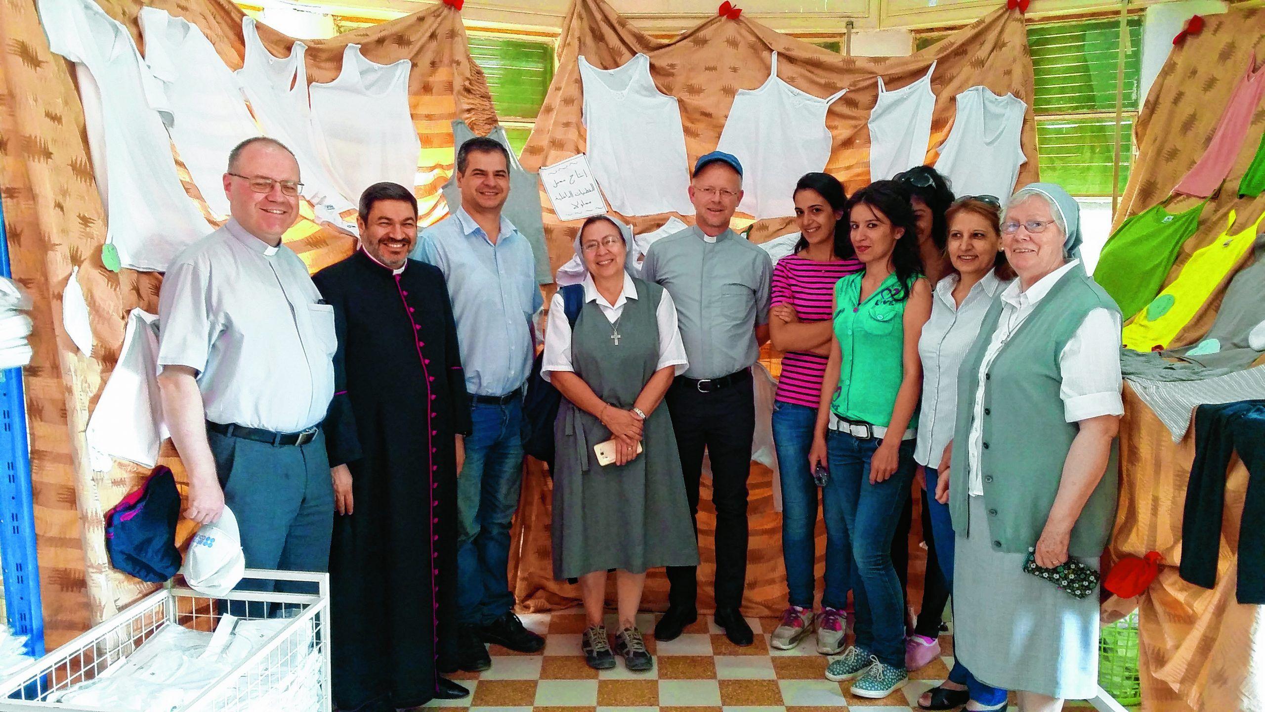 Besuchten die Mitarbeiterinnen der Näherei im christlichen Bergdorf Maalula nahe Damaskus: Domkapitular Dr. Thomas Witt (l.), Monsignore Thomas Habib (Sekretär der Nuntiatur von Damaskus, 2. v. l.), Sr. Annie Demerjian (4. v. l.), Monsignore Prof. Dr. Peter Schallenberg (Mitte) und Provinzoberin Sr. Helen Haigh von den Schwestern Jesu und Mariens (r.).Foto: cpd