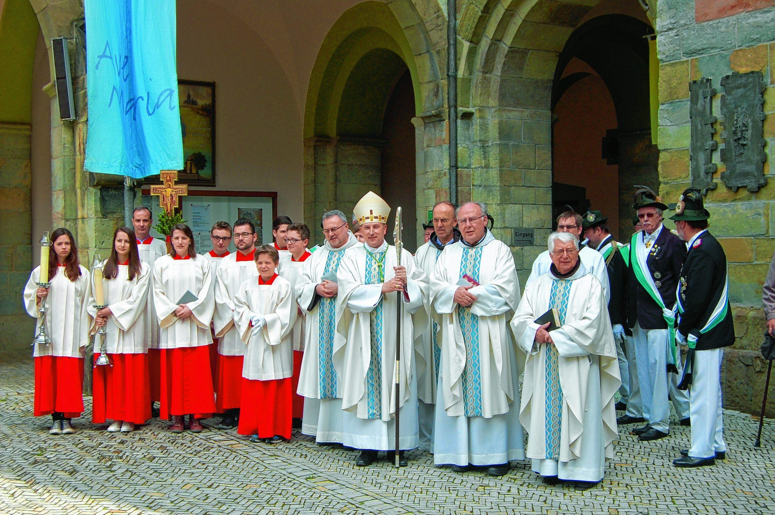 Das obligatorische Gruppenfoto nach dem Gottesdienst: Die Zelebranten, Ministranten und die Delegation der Schützen vor der Wallfahrtsbasilika. Foto: Nückel