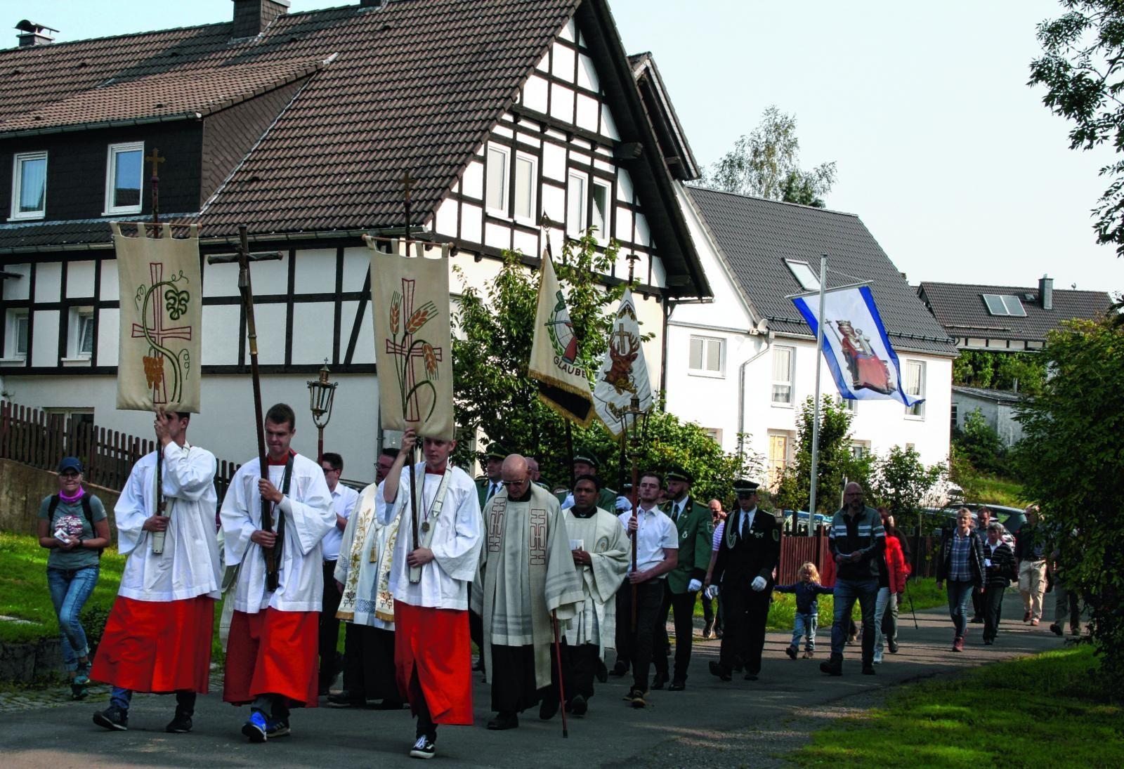 Wer den Sendschotter Umgang von „A bis Z“ mitmachen wollte, der musste gut zu Fuß und ein Frühaufsteher sein. Bereits um 5.30 Uhr fand die Eröffnungsmesse vor der Kapelle in Sendschotten statt. Während des 13,8 Kilometer langen Umgangs gab es Stationsfeiern in Hützemert, Wegeringhausen, Scheda, Germinghausen und in Essinghausen. Dabei wurden jeweils Evangelium und Fürbitten vorgetragen sowie Lieder gesungen und der sakramentale Segen erteilt. Die Gläubigen waren eingeladen, entweder privat in kleinen Gruppen zu gehen oder gemeinsam mit den Geistlichen. Diese waren mit Pfarrer Markus Leber, Vikar Jai und Vikar Jobin, der im September im Kirchspiel Drolshagen aushilft, Pfarrer i. R. Norbert Keller, Bruder Martin Lütticke, Pfarrer Thomas Hengstebeck und Pfarrer i. R. Rupert Bechheim zahlreich vertreten.