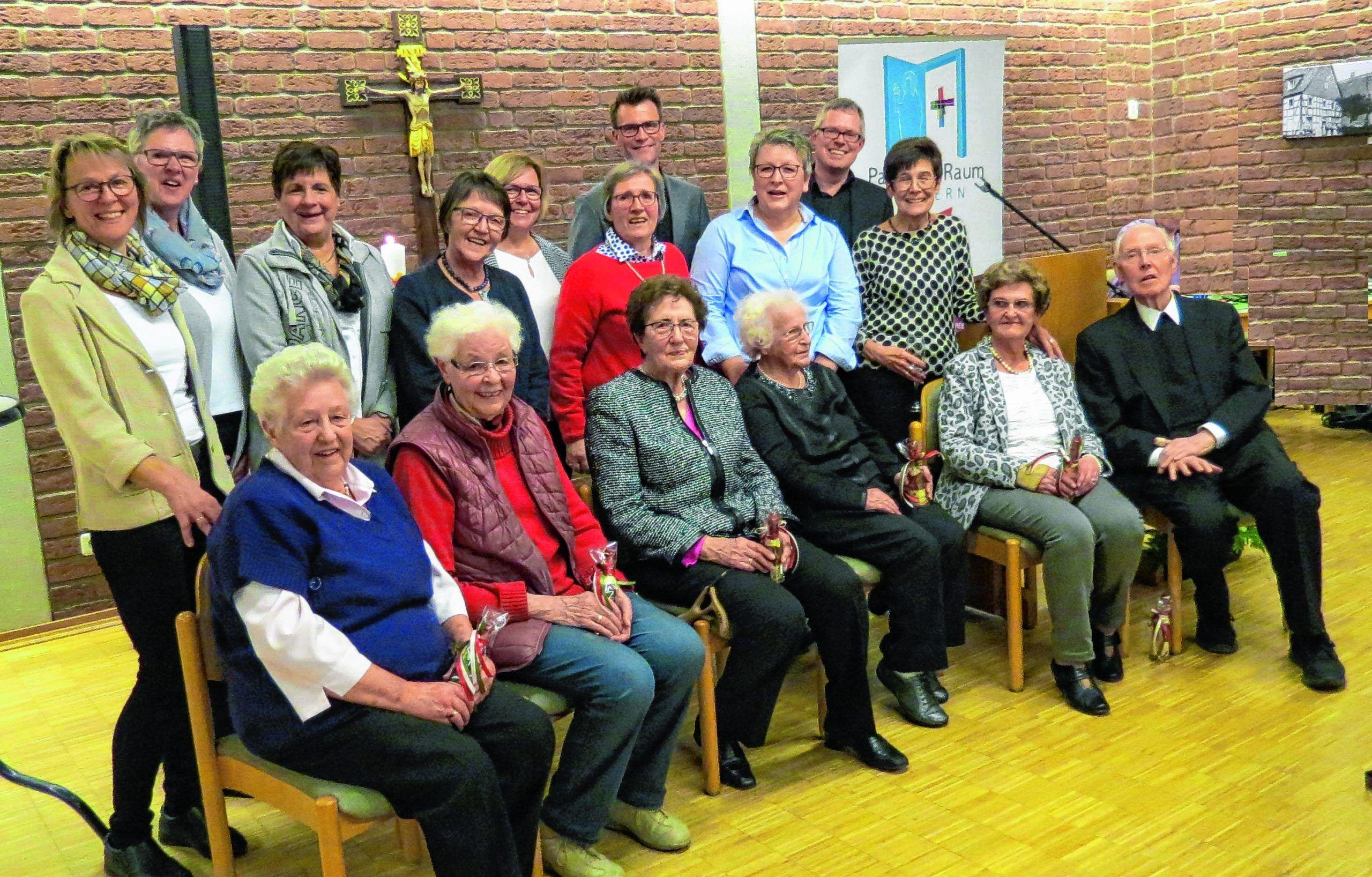 Zum Jubiläum der kfd St.Johannes in Sundern wurden alle 90-Jährigen geehrt. Mit ihnen posieren der kfd-Vorstand, Diözesanpräses Roland Schmitz (hinten) und Pfarrer Stefan Siebert (rechts). Fotos: kfd