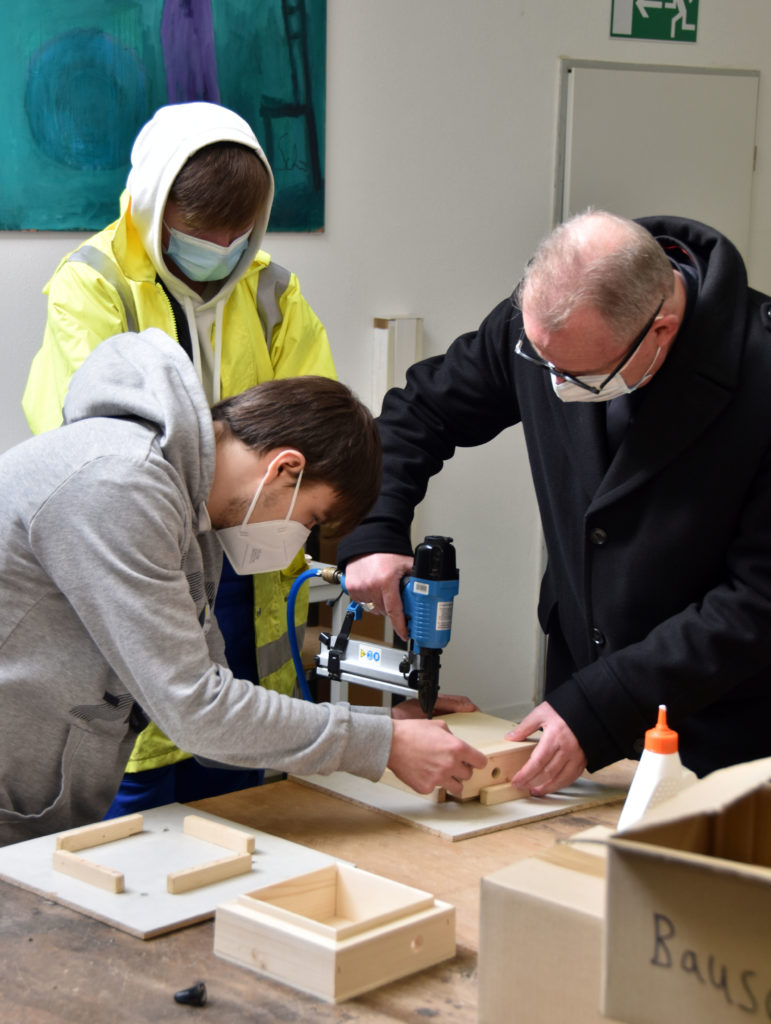 Schrauben, leimen, tackern – die Besucher beim Katholischen Jugendwerk Siegen durften selbst in der Werkstatt anpacken. Hier hat der bundesweite Auftakt zum Josefstag 2022 stattgefunden. Damit machen katholische Einrichtungen der Jugendsozialarbeit jährlich auf sich aufmerksam.