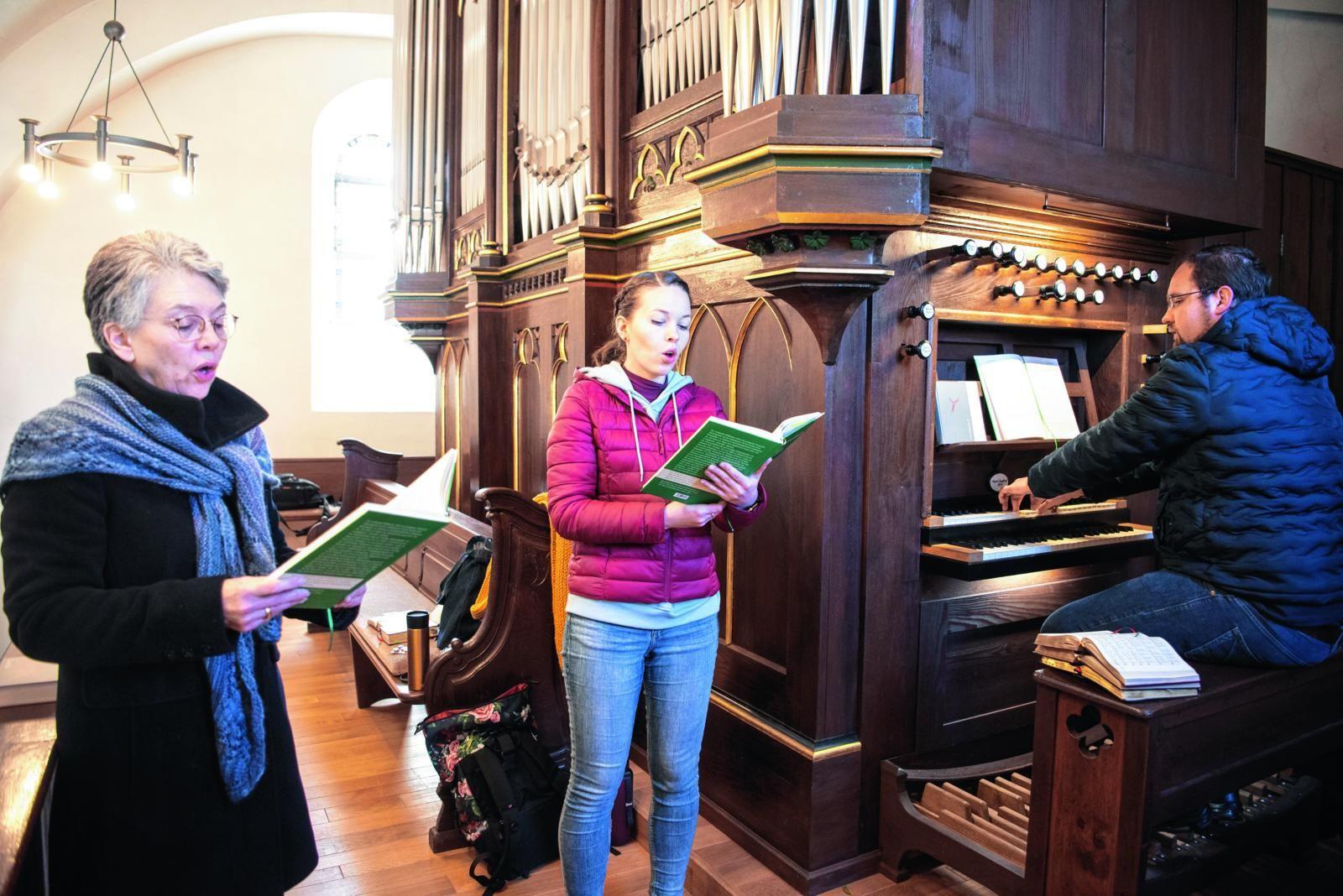 Einstimmen für die Messe: die Kantorinnen Christiane (links) und Lea Wirz mit Organist Marius Hartmann. Foto: Flüter