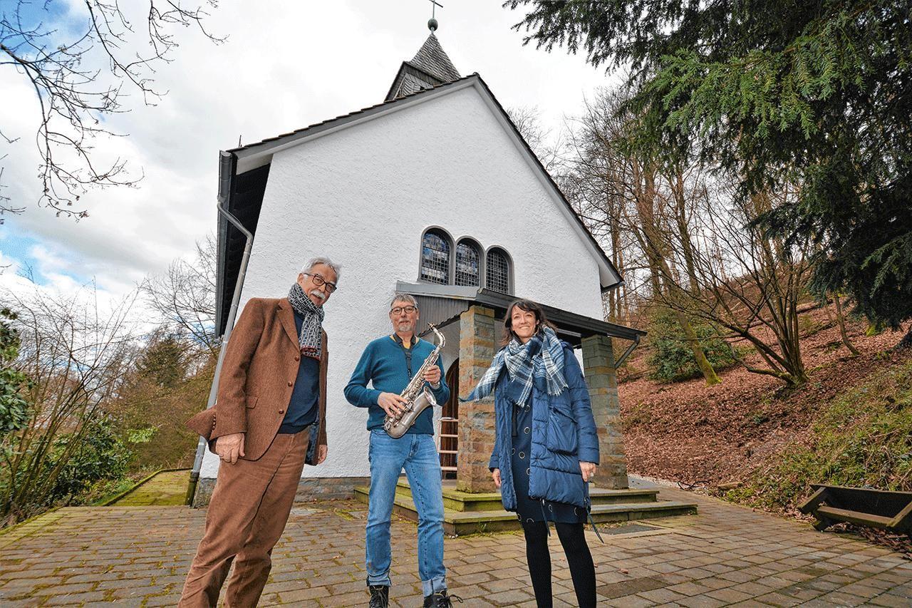 Johannes Stefan Müller, Vorsitzender des Trägervereins St. Hedwigshaus, Saxofonist Tiko Hölz und Nike Alkema, Leiterin der Akademie am Tönsberg (v. l.), vor der Hedwigskapelle. Die Renovierungsarbeiten dort sind fast abgeschlossen. (Fotos: Karin Prignitz)