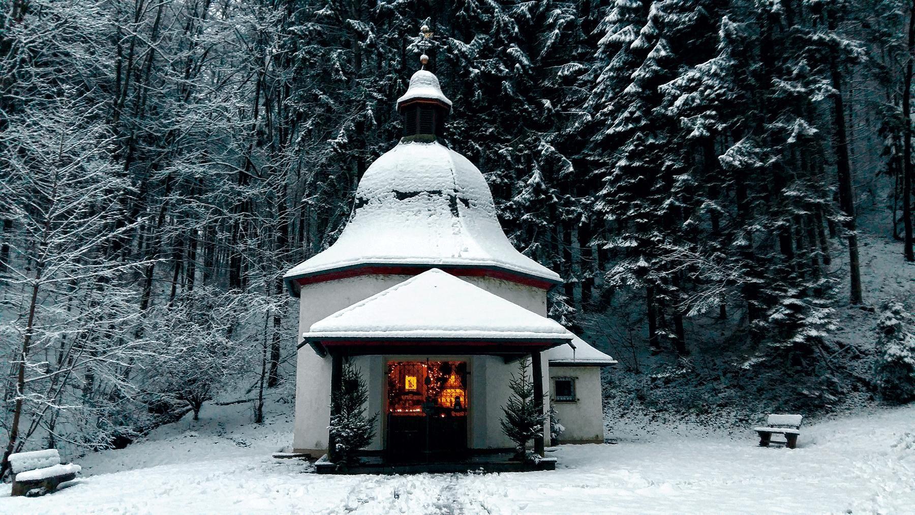 Die heutige Kapelle Waldenburg, die in den Jahren 1965/66 gebaut wurde, im tiefen Schnee. Hier sieht man ansatzweise auch die beleuchtete Krippe und das Gnadenbild. (Foto: Meinolf Lüttecke)