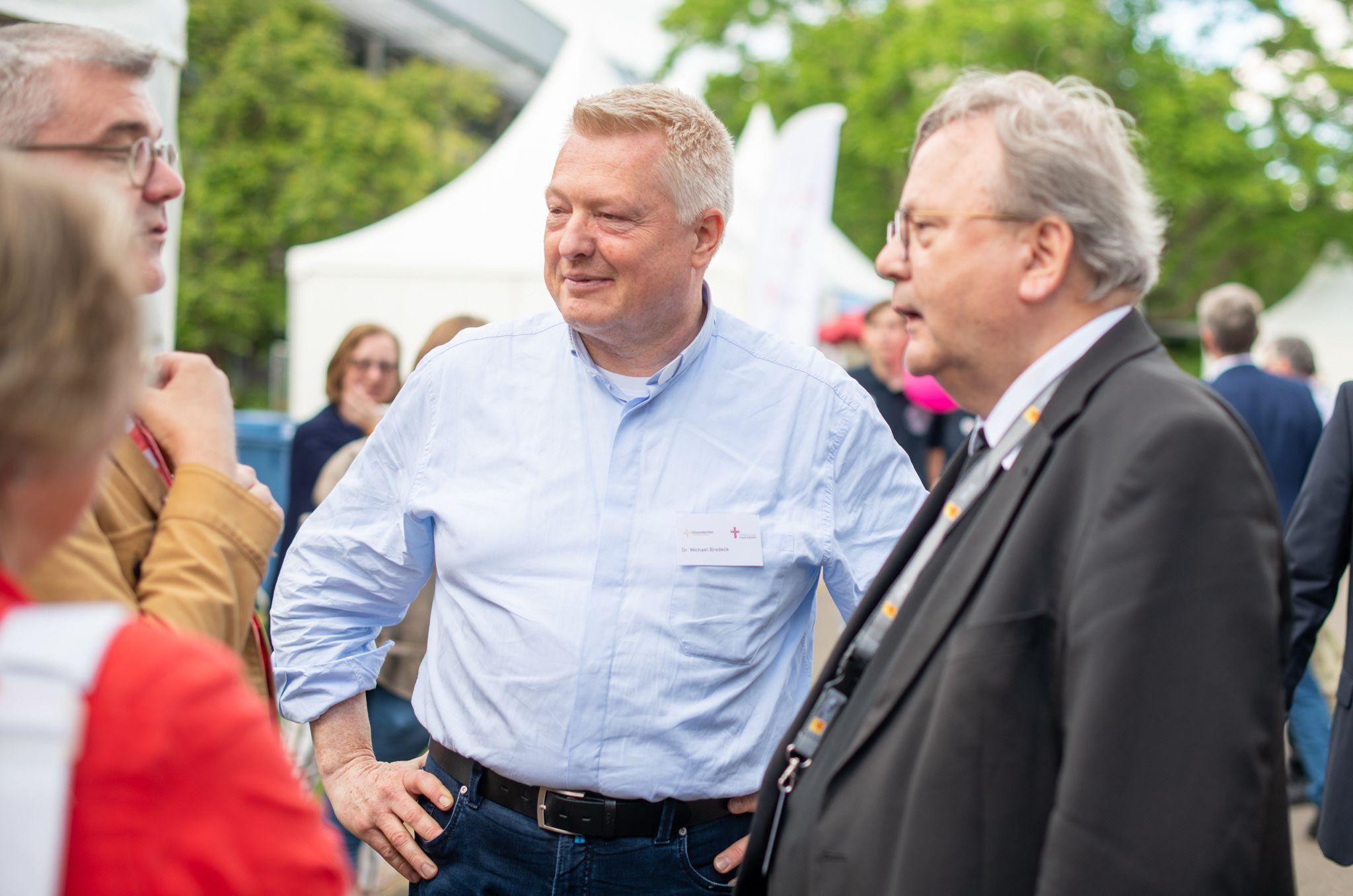 Das ist das Schöne am Katholikentag: Man trifft viele alte Bekannte. Bischof Dr. Franz-Josef Bode (r.) hier am Paderborner Stand im Gespräch mit Monsignore Dr. Michael Bredeck. (Foto: Till Kupitz/Erzbistum Paderborn)